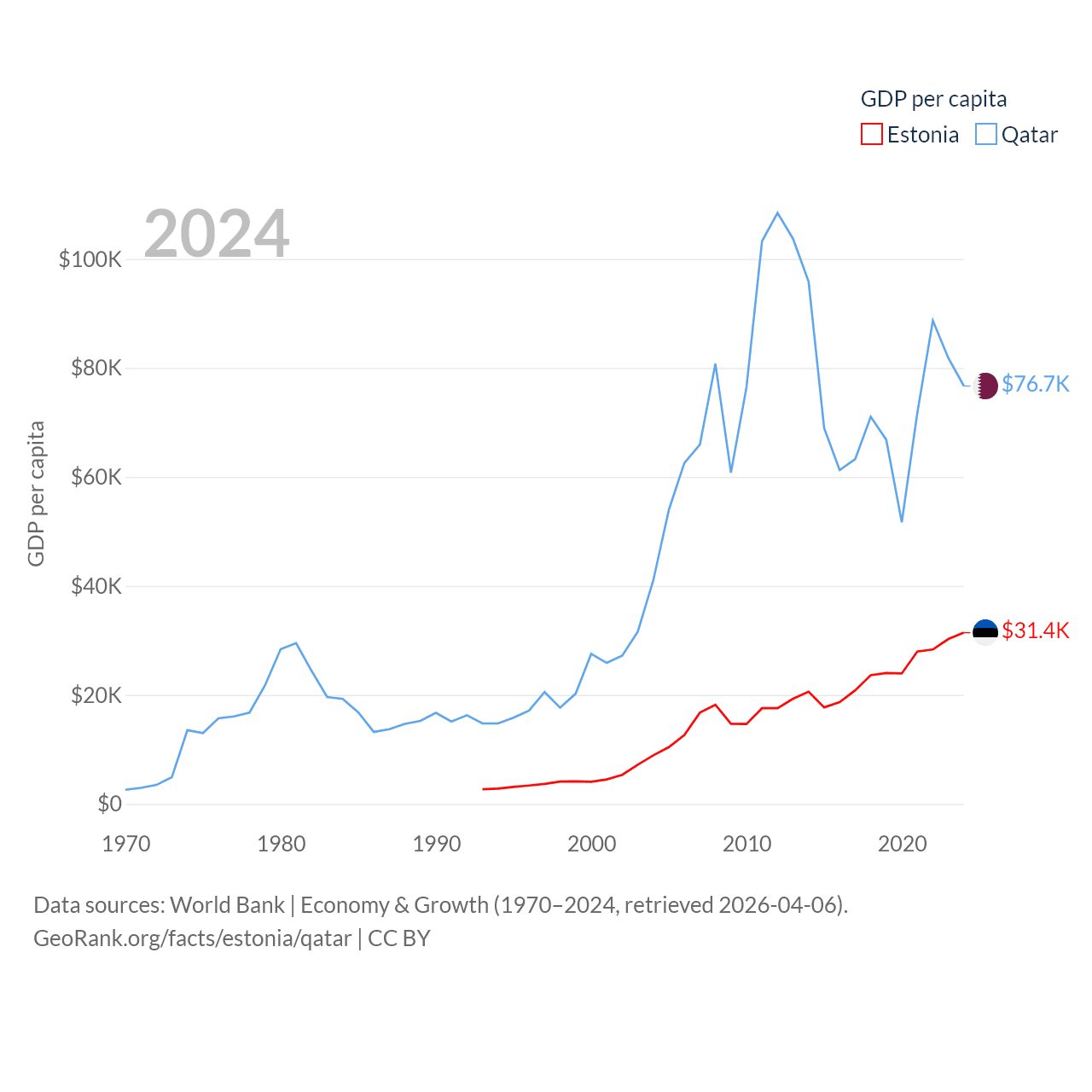 By GDP, Estonia ranks 100/197 ($43.1B) and Qatar ranks 56/197 ($219B). By GDP per capita, Estonia ranks 40/197 ($31,428), while Qatar ranks 11/197 ($76,689).