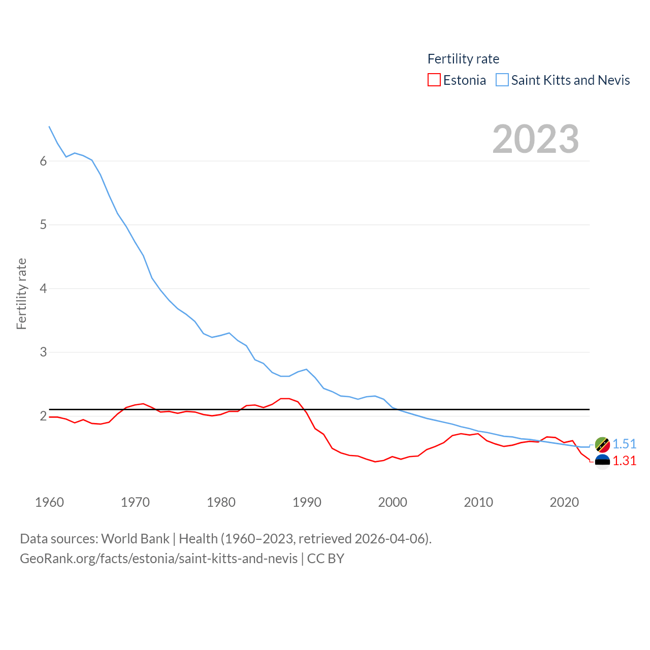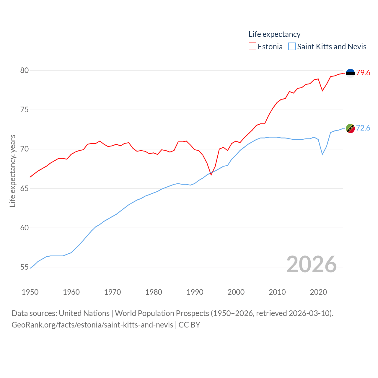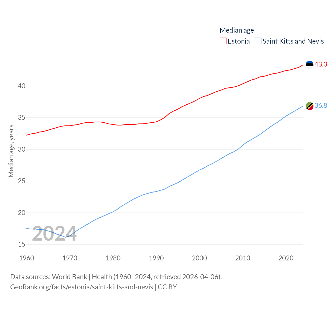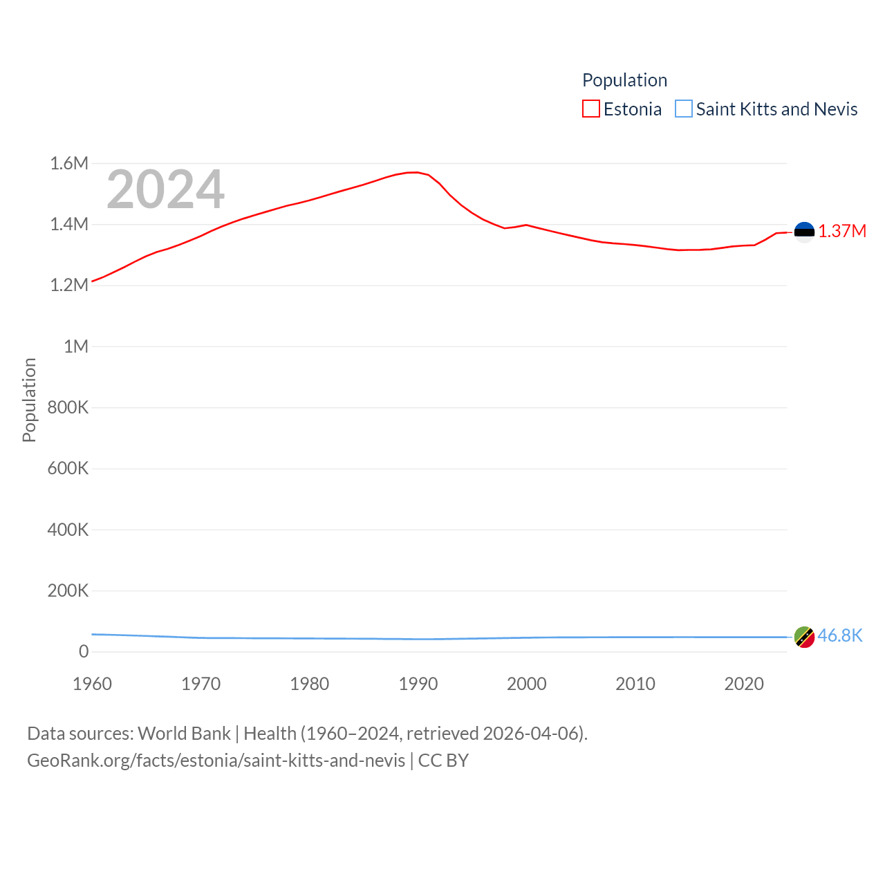 Estonia has a population of 1.37M (ranked 153/197), compared with 46.8K in Saint Kitts and Nevis (ranked 189/197). Estonia's land area is 16,498 sq mi versus 100.4 sq mi for Saint Kitts and Nevis (ranked 129th vs. 189th).