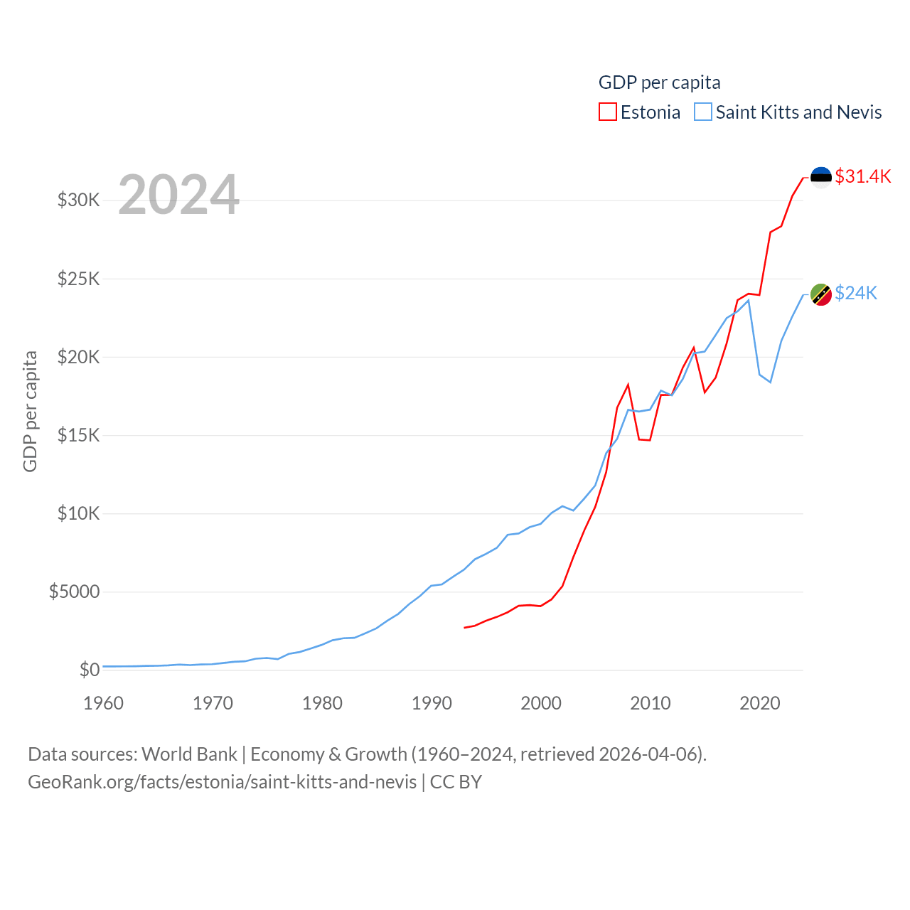 By GDP, Estonia ranks 100/197 ($43.1B) and Saint Kitts and Nevis ranks 187/197 ($1.12B). By GDP per capita, Estonia ranks 40/197 ($31,428), while Saint Kitts and Nevis ranks 51/197 ($23,961).