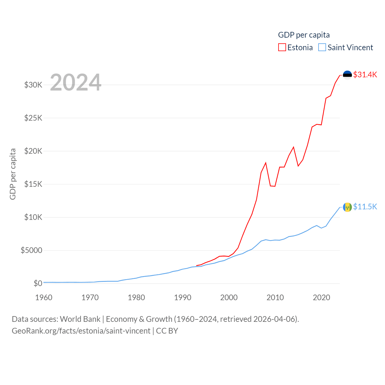 By GDP, Estonia ranks 100/197 ($43.1B) and Saint Vincent ranks 186/197 ($1.16B). By GDP per capita, Estonia ranks 40/197 ($31,428), while Saint Vincent ranks 81/197 ($11,501).