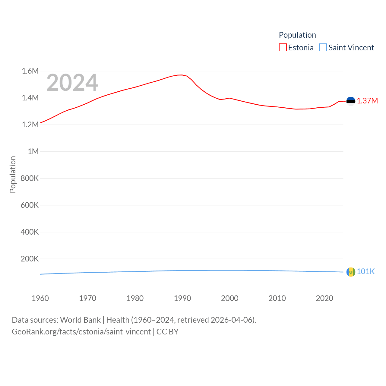 Estonia has a population of 1.37M (ranked 153/197), compared with 101K in Saint Vincent (ranked 184/197). Estonia's land area is 16,498 sq mi versus 150.6 sq mi for Saint Vincent (ranked 129th vs. 185th).