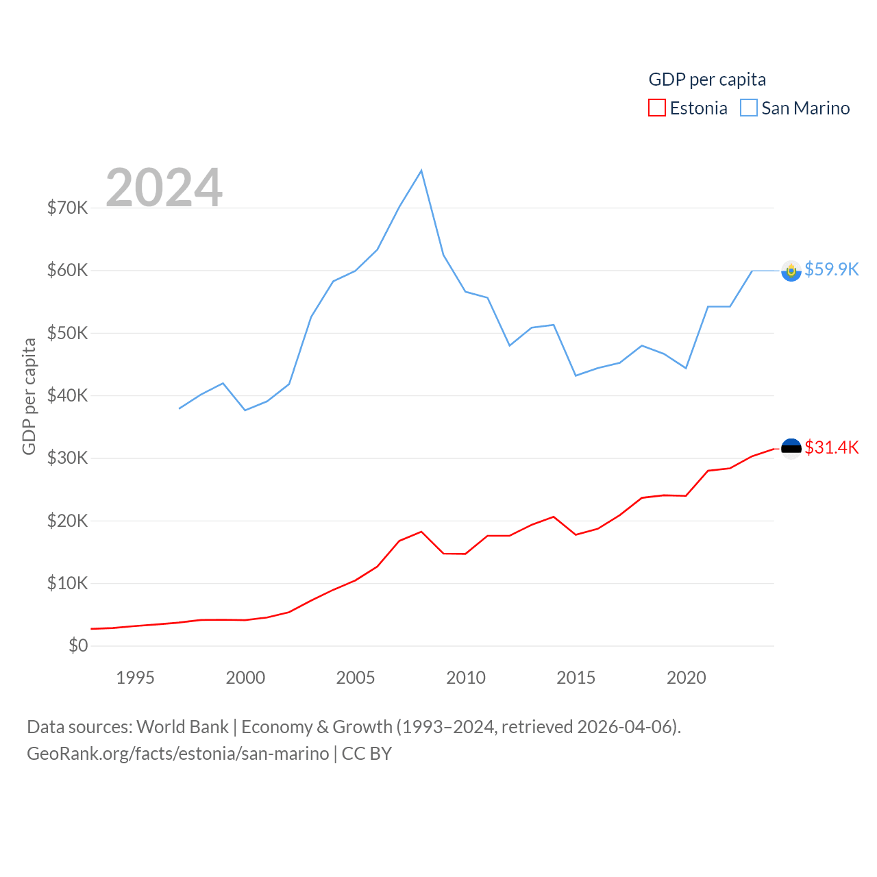 By GDP, Estonia ranks 100/197 ($43.1B) and San Marino ranks 180/197 ($2.03B). By GDP per capita, Estonia ranks 40/197 ($31,428), while San Marino ranks 15/197 ($59,880).