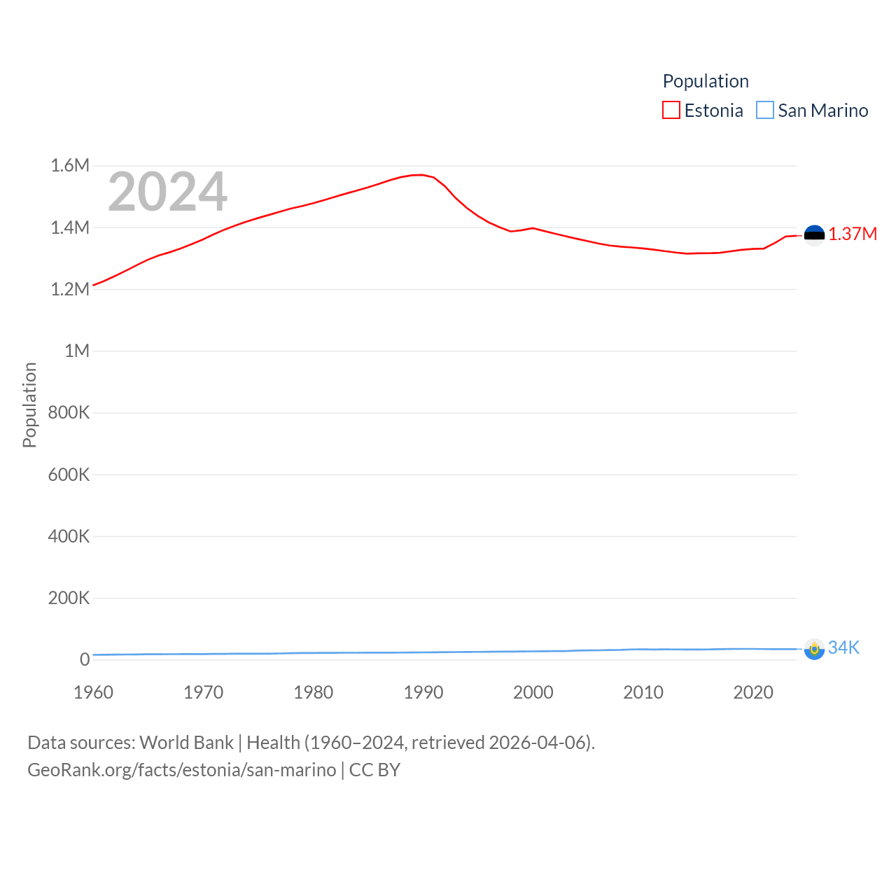 Estonia has a population of 1.37M (ranked 153/197), compared with 34K in San Marino (ranked 193/197). Estonia's land area is 16,498 sq mi versus 23.2 sq mi for San Marino (ranked 129th vs. 193rd).