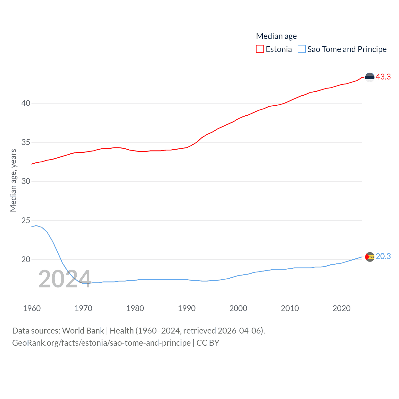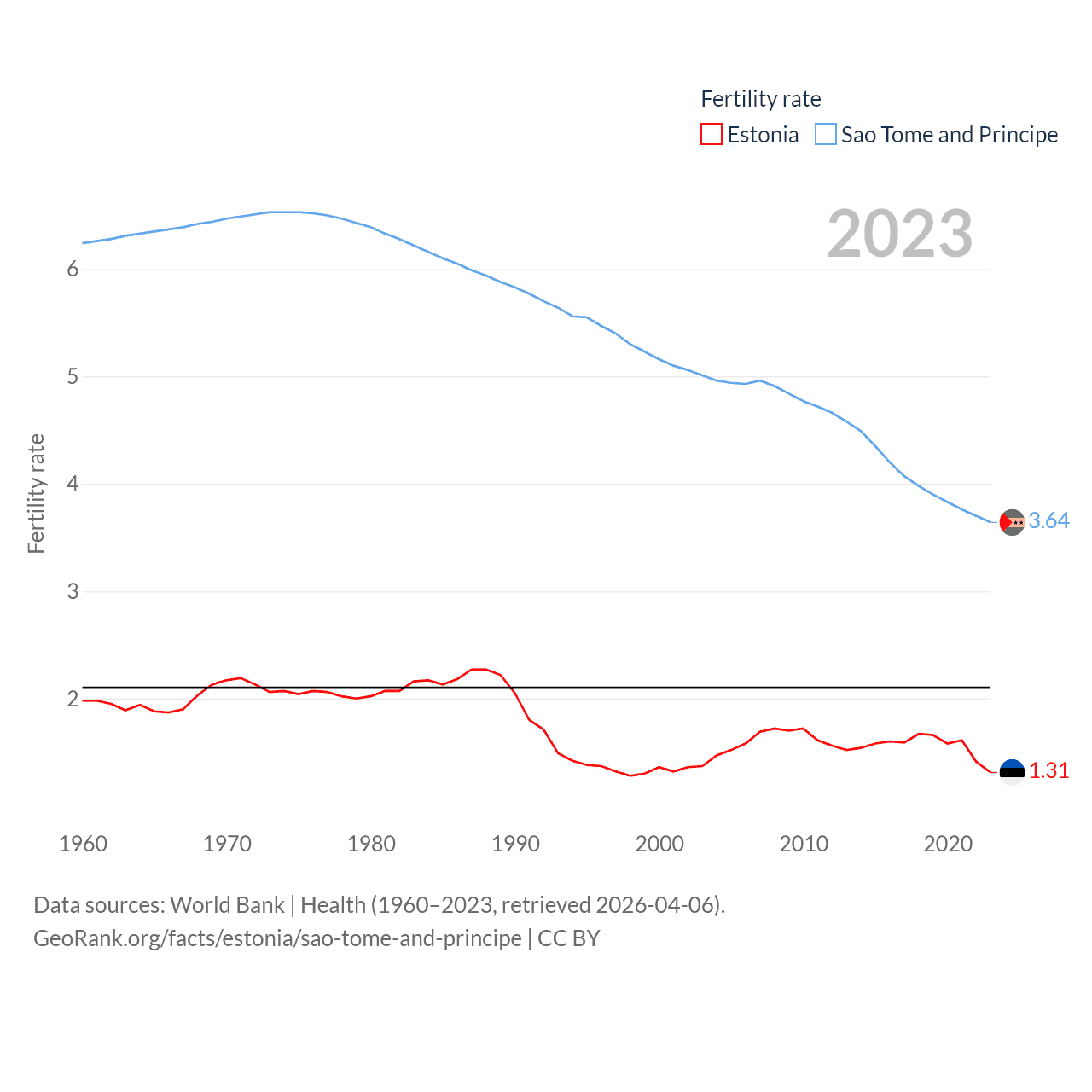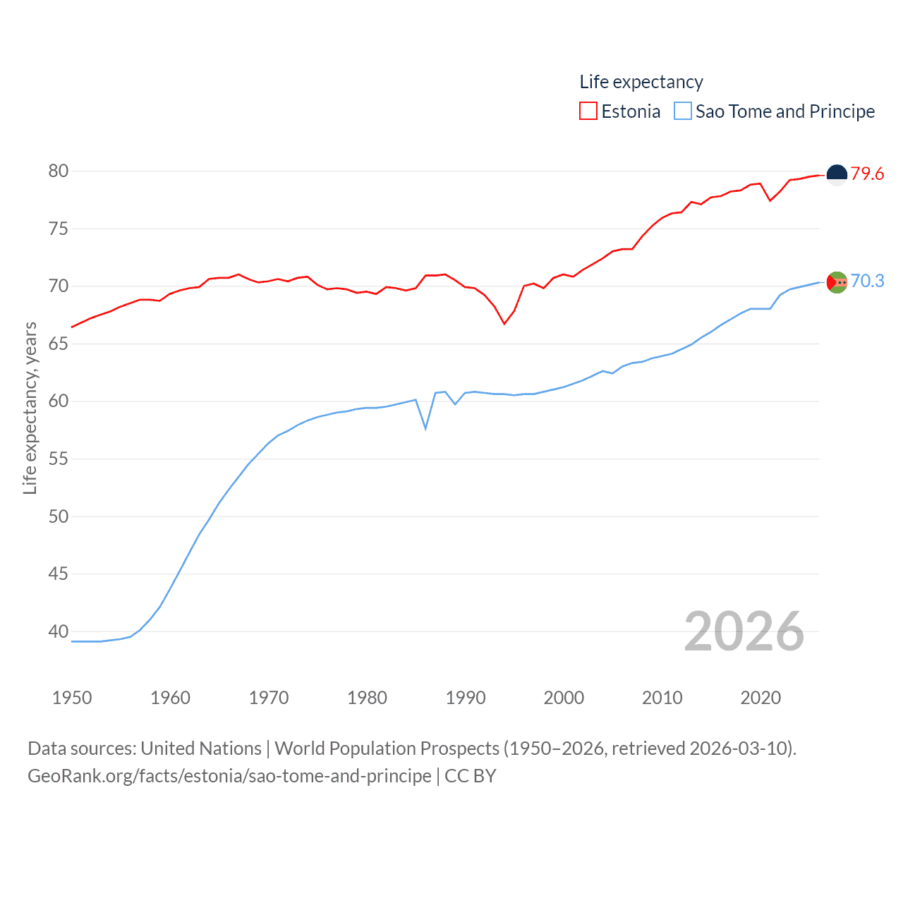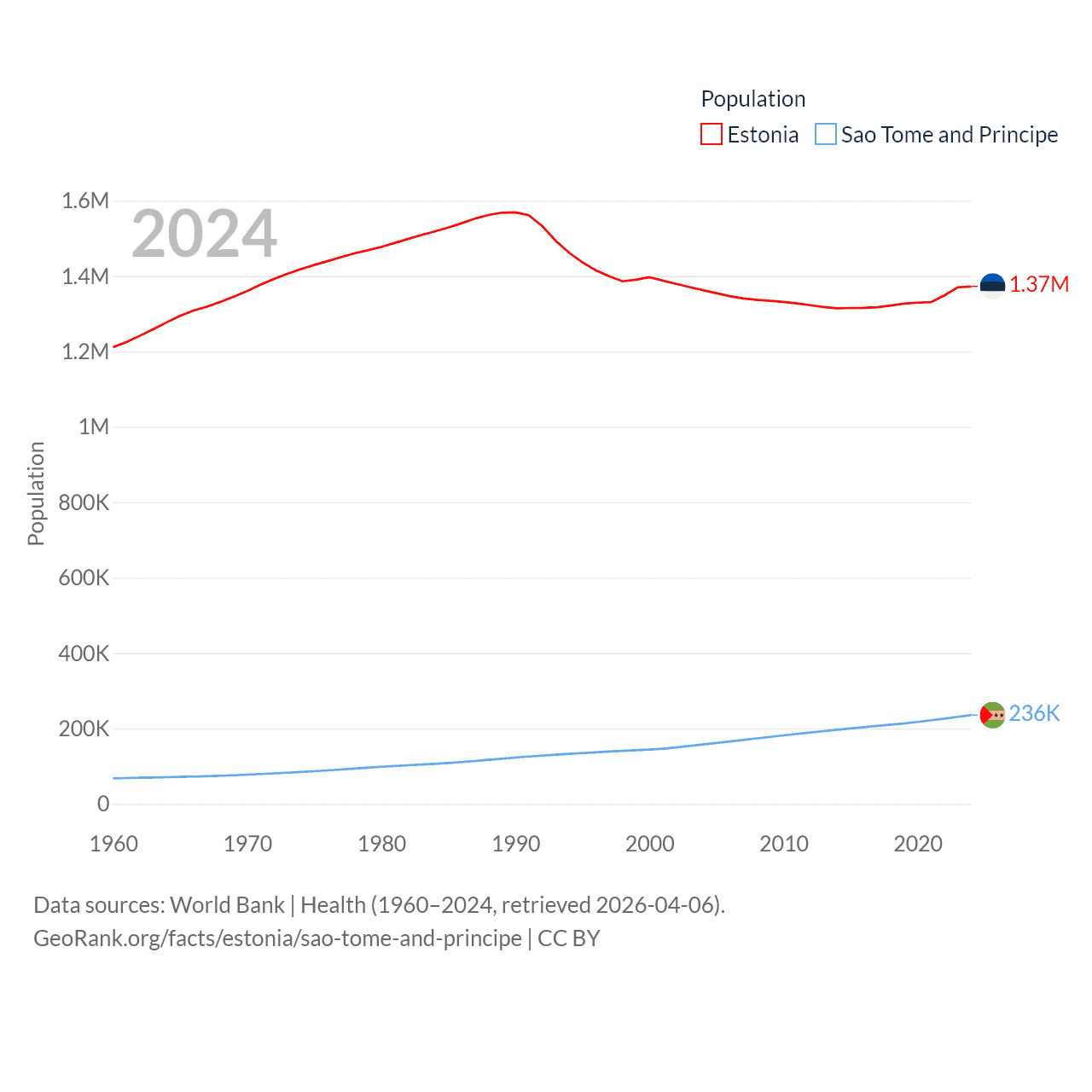 Estonia has a population of 1.37M (ranked 153/197), compared with 236K in Sao Tome and Principe (ranked 176/197). Estonia's land area is 16,498 sq mi versus 371 sq mi for Sao Tome and Principe (ranked 129th vs. 172nd).