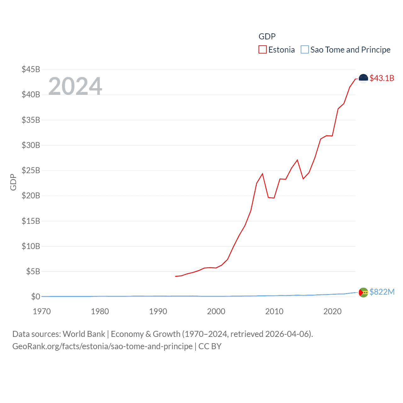 By GDP, Estonia ranks 100/197 ($43.1B) and Sao Tome and Principe ranks 189/197 ($822M). By GDP per capita, Estonia ranks 40/197 ($31,428), while Sao Tome and Principe ranks 134/197 ($3,491).