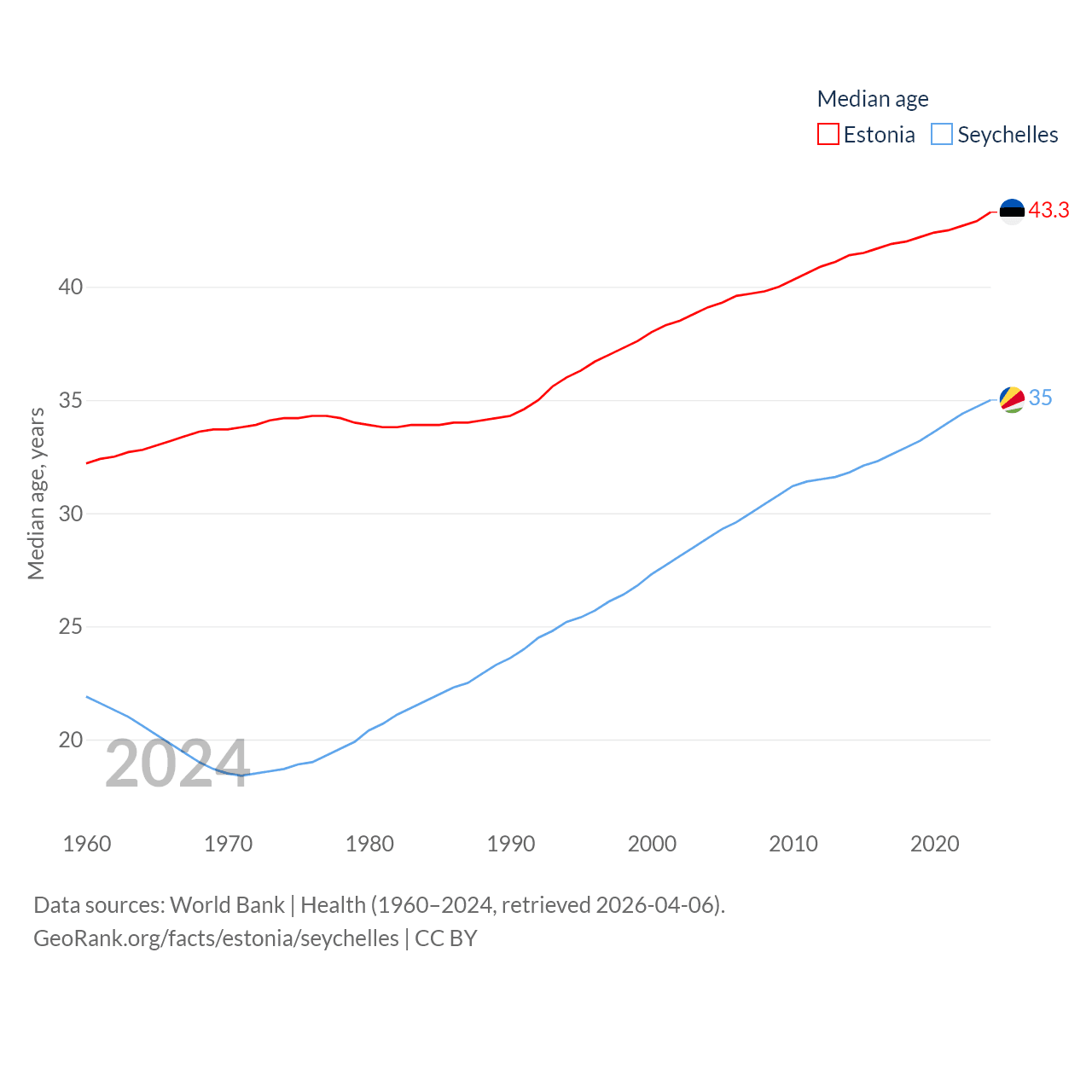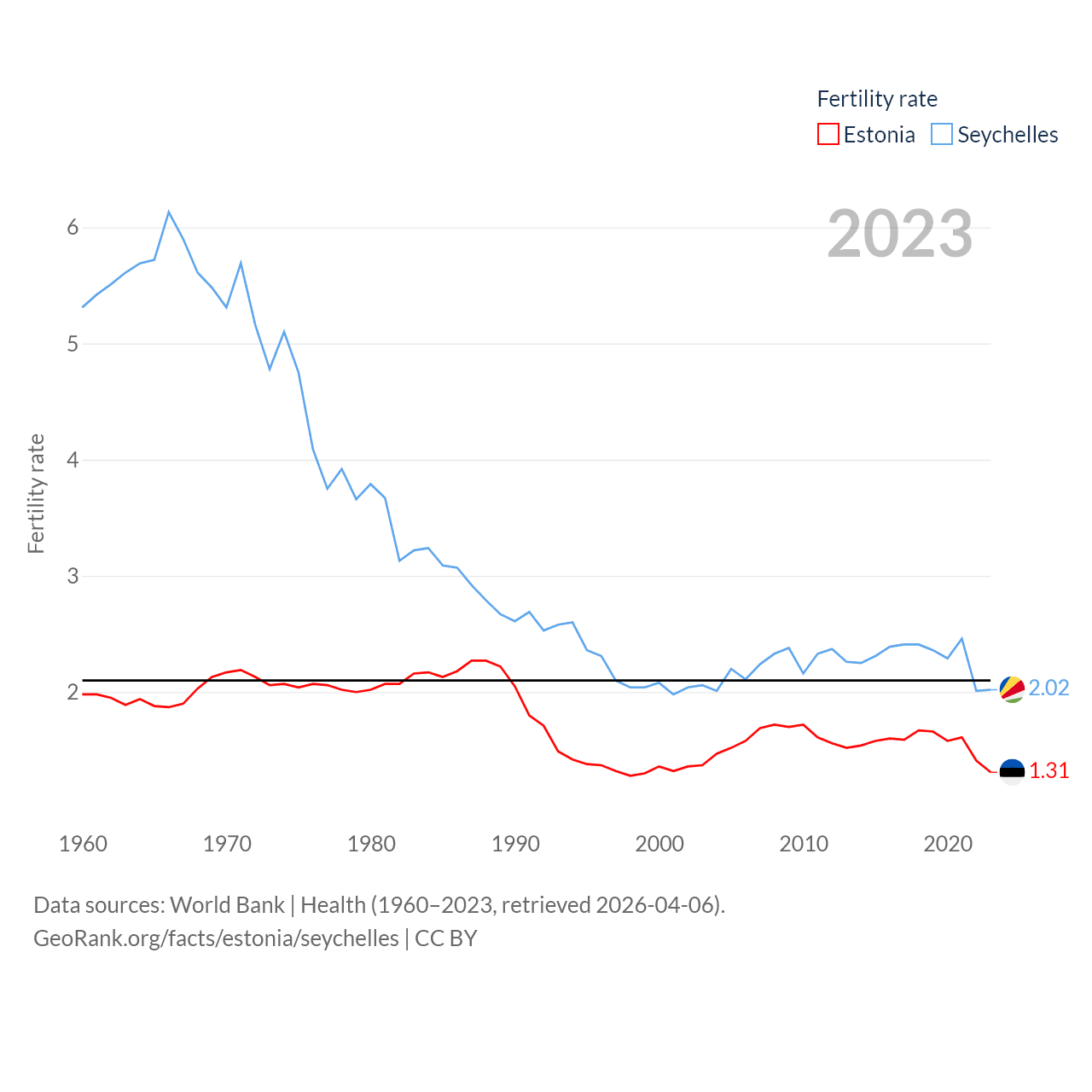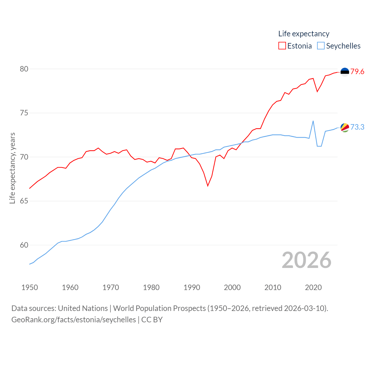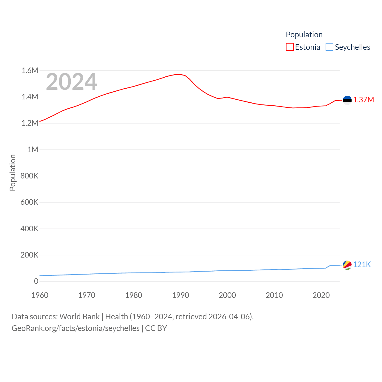 Estonia has a population of 1.37M (ranked 153/197), compared with 121K in The Seychelles (ranked 181/197). Estonia's land area is 16,498 sq mi versus 177.6 sq mi for The Seychelles (ranked 129th vs. 181st).