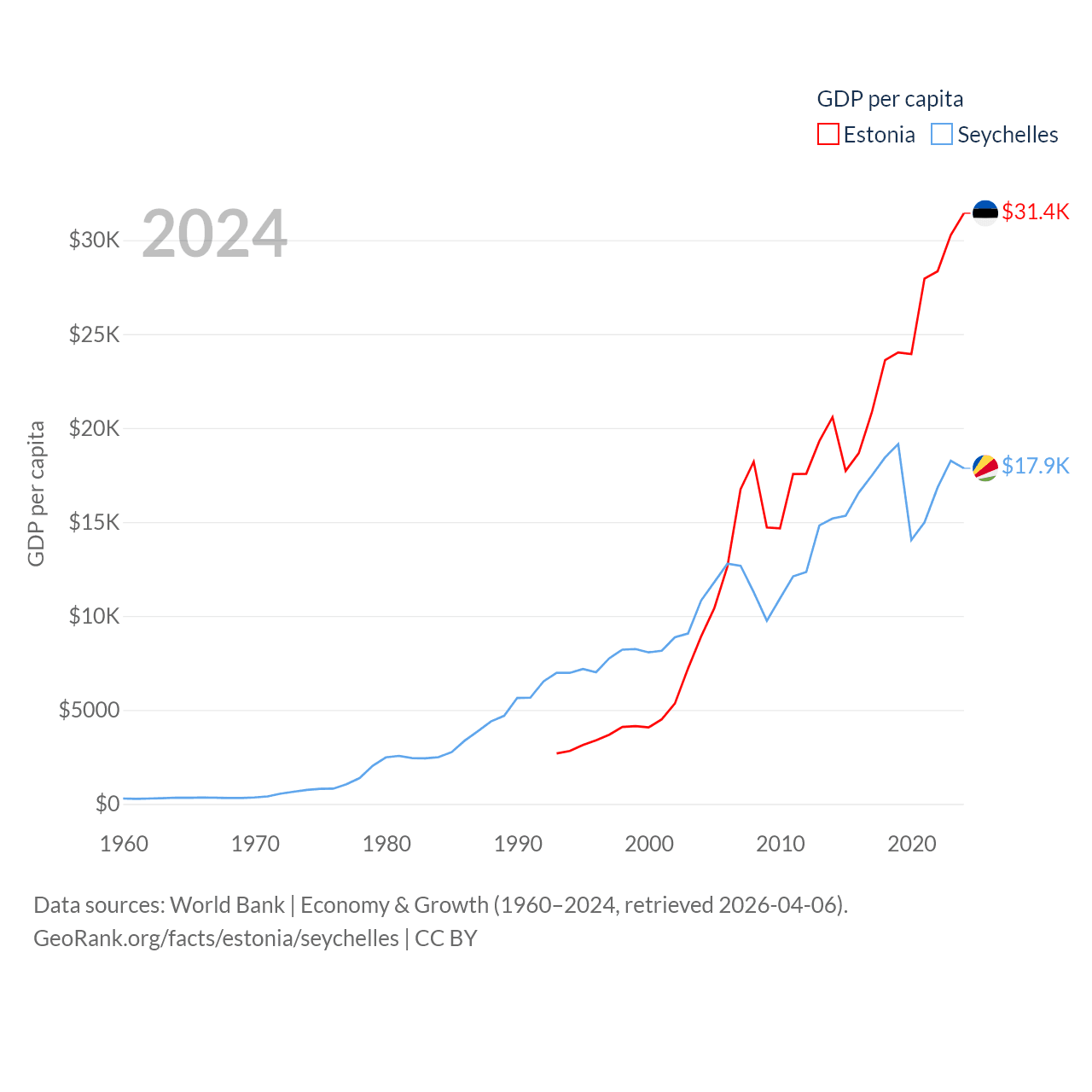 By GDP, Estonia ranks 100/197 ($43.1B) and The Seychelles ranks 178/197 ($2.17B). By GDP per capita, Estonia ranks 40/197 ($31,428), while The Seychelles ranks 63/197 ($17,859).