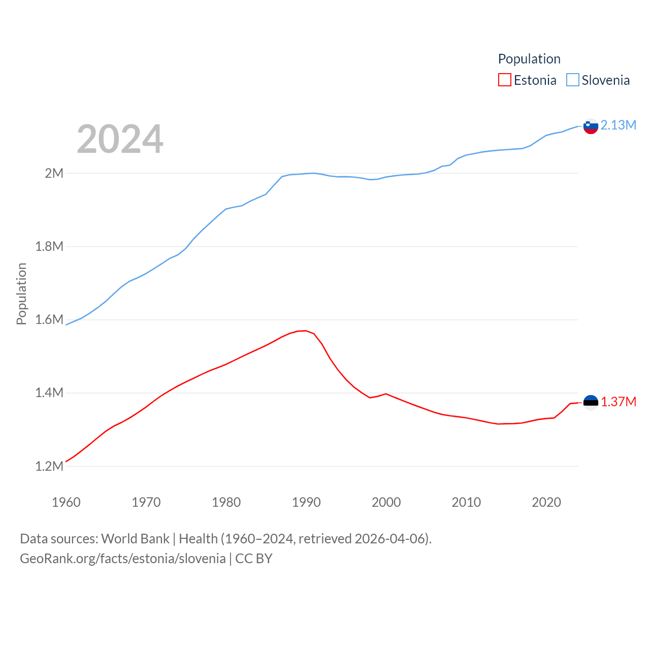 Estonia has a population of 1.37M (ranked 153/197), compared with 2.13M in Slovenia (ranked 147/197). Estonia's land area is 16,498 sq mi versus 7,774 sq mi for Slovenia (ranked 129th vs. 151st).