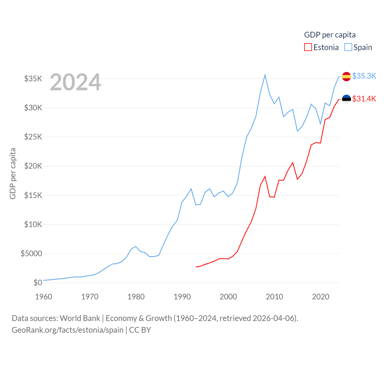 By GDP, Estonia ranks 100/197 ($43.1B) and Spain ranks 15/197 ($1.73T). By GDP per capita, Estonia ranks 40/197 ($31,428), while Spain ranks 32/197 ($35,327).