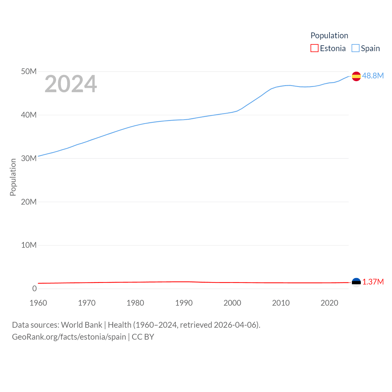 Estonia has a population of 1.37M (ranked 153/197), compared with 48.8M in Spain (ranked 32/197). Estonia's land area is 16,498 sq mi versus 192,934 sq mi for Spain (ranked 129th vs. 51st).