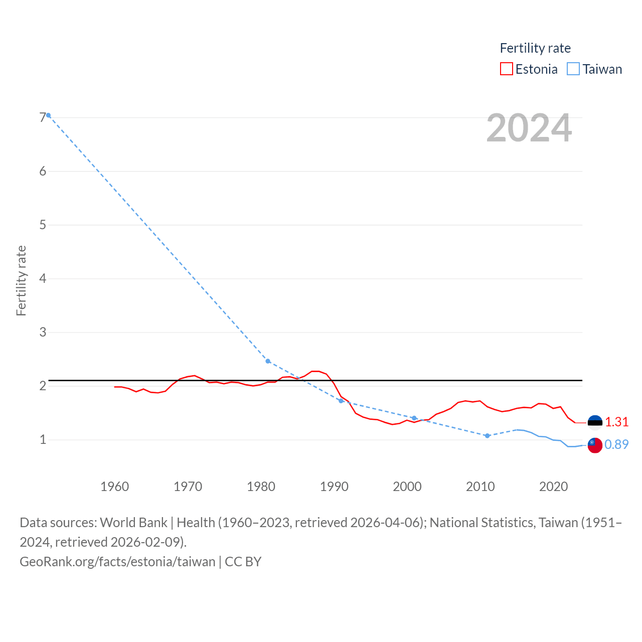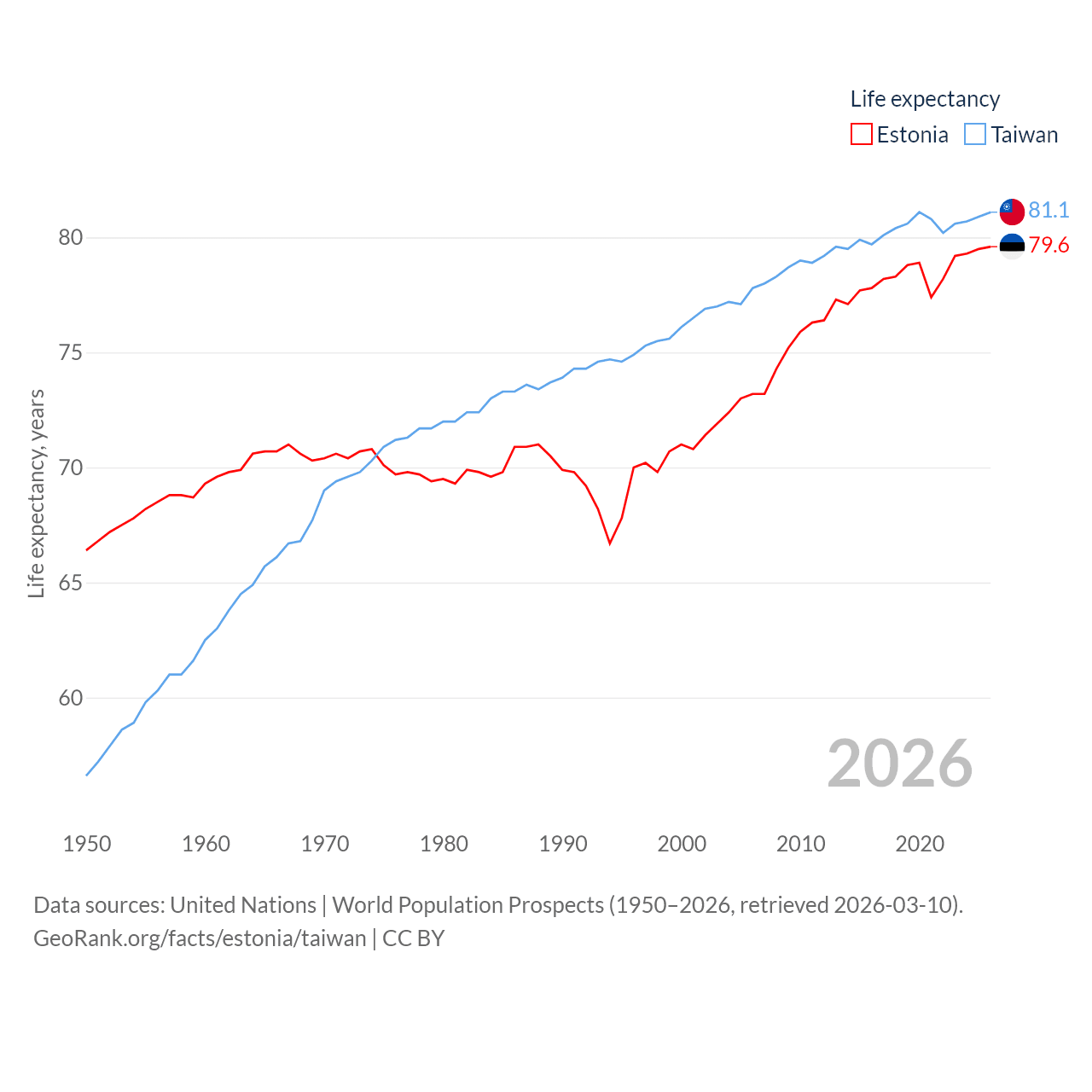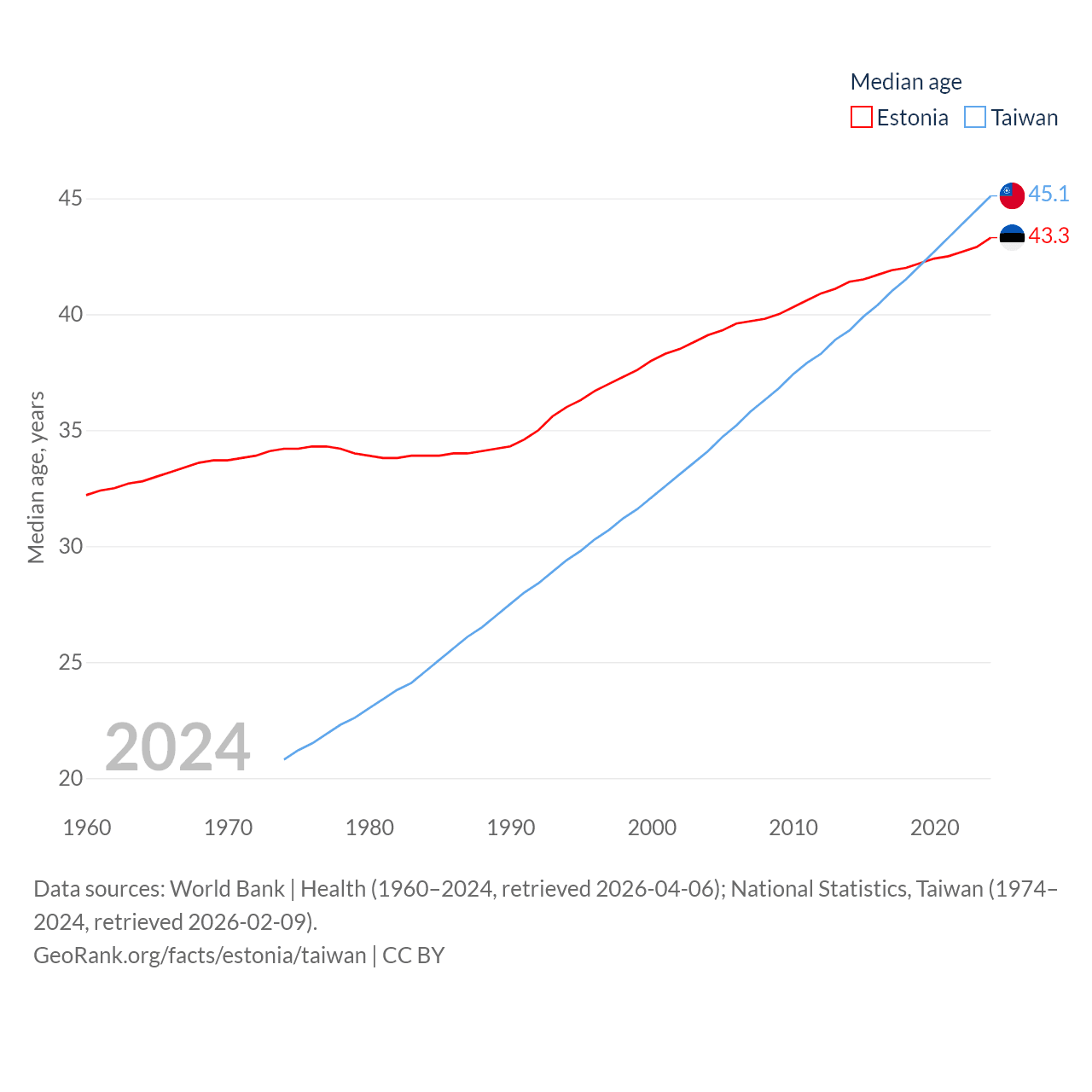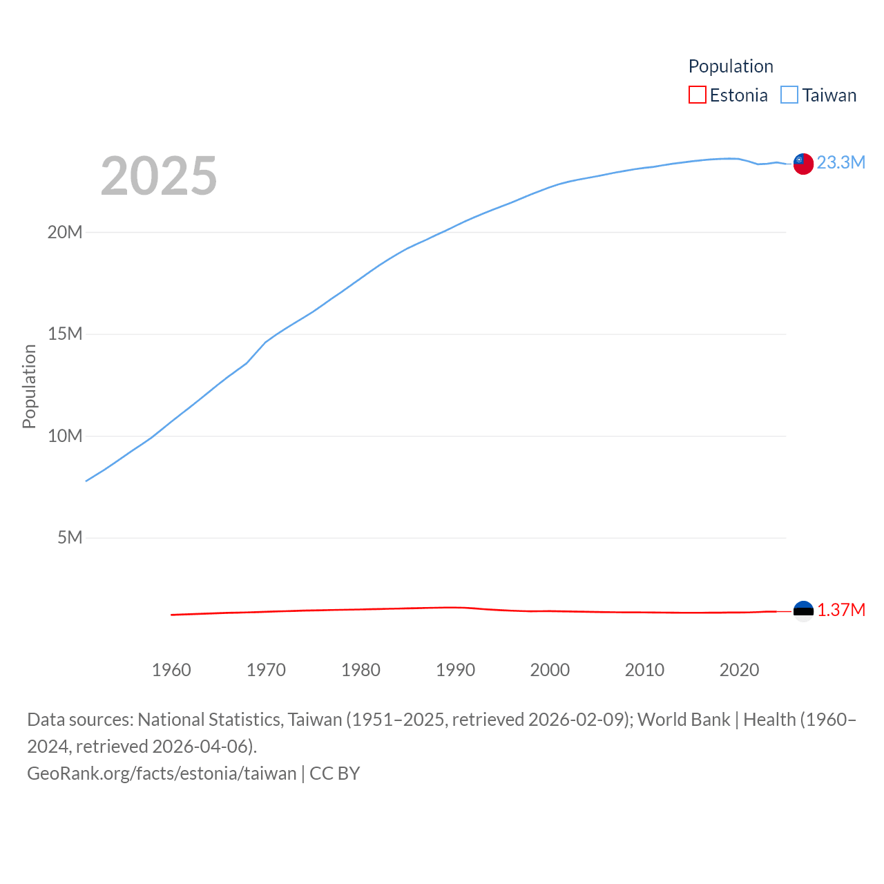 Estonia has a population of 1.37M (ranked 153/197), compared with 23.3M in Taiwan (ranked 60/197). Estonia's land area is 16,498 sq mi versus 13,976 sq mi for Taiwan (ranked 129th vs. 133rd).