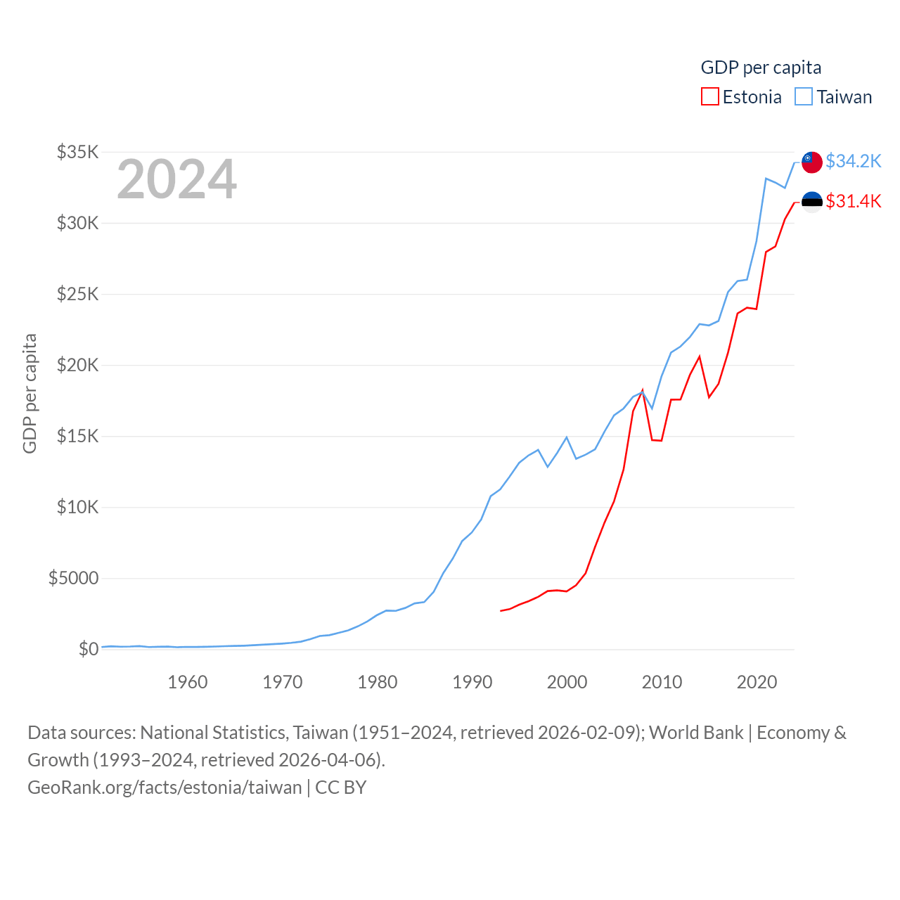 By GDP, Estonia ranks 100/197 ($43.1B) and Taiwan ranks 22/197 ($802B). By GDP per capita, Estonia ranks 40/197 ($31,428), while Taiwan ranks 35/197 ($34,238).