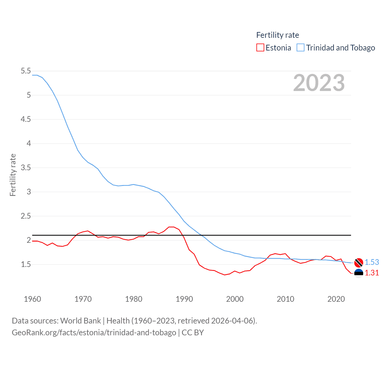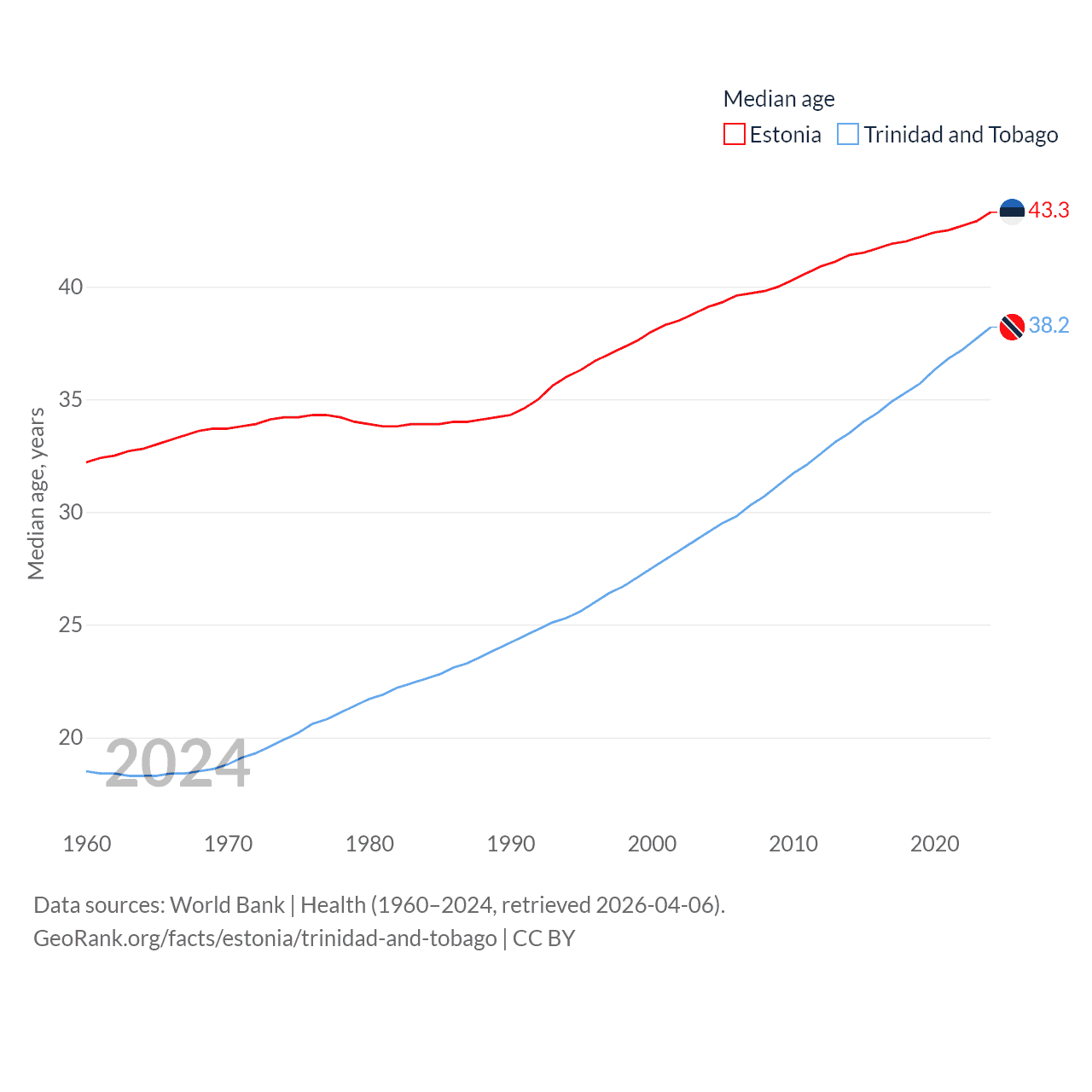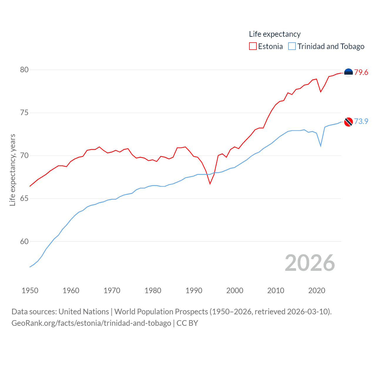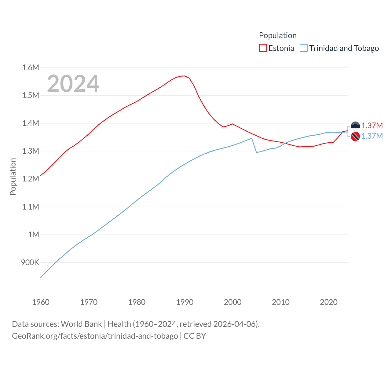 Estonia has a population of 1.37M (ranked 153/197), compared with 1.37M in Trinidad and Tobago (ranked 154/197). Estonia's land area is 16,498 sq mi versus 1,981 sq mi for Trinidad and Tobago (ranked 129th vs. 166th).