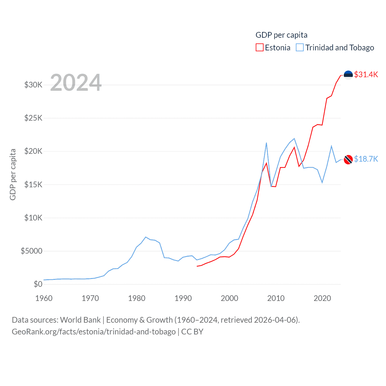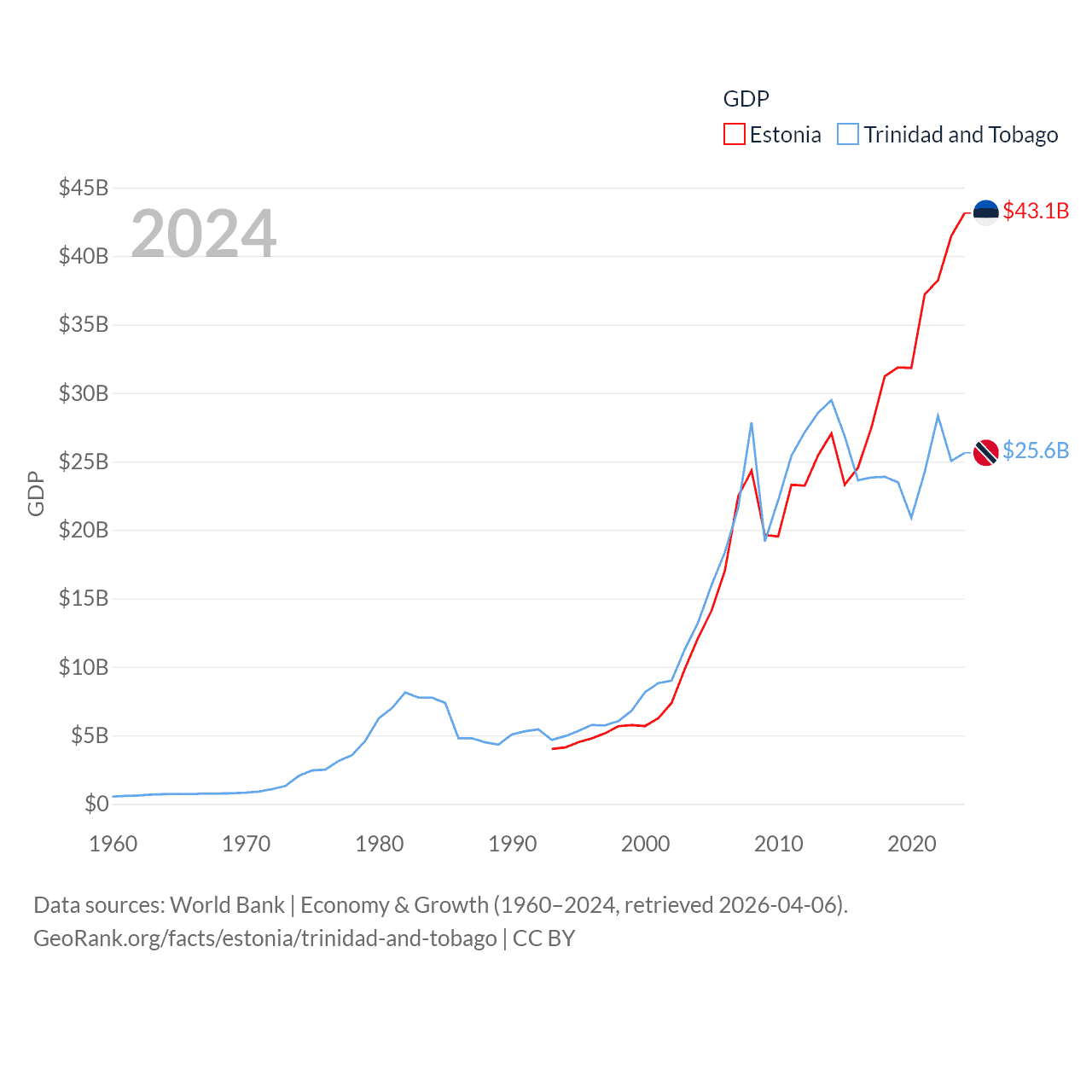 By GDP, Estonia ranks 100/197 ($43.1B) and Trinidad and Tobago ranks 115/197 ($25.6B). By GDP per capita, Estonia ranks 40/197 ($31,428), while Trinidad and Tobago ranks 61/197 ($18,733).