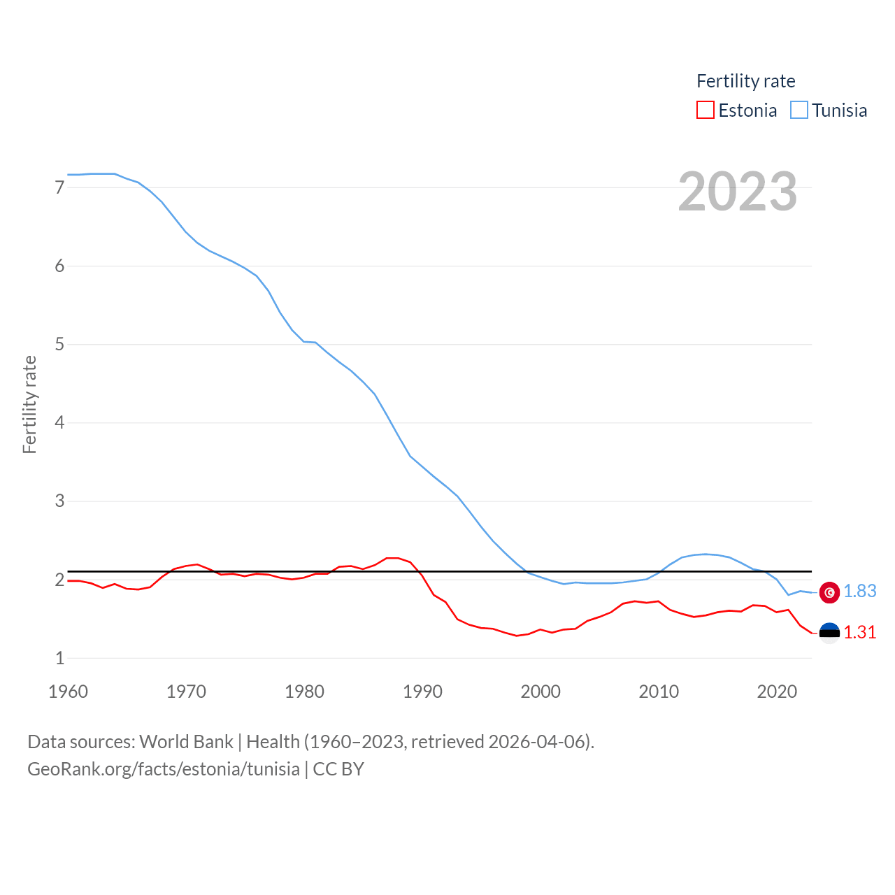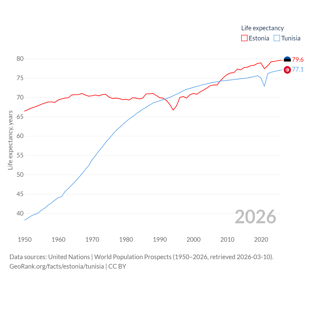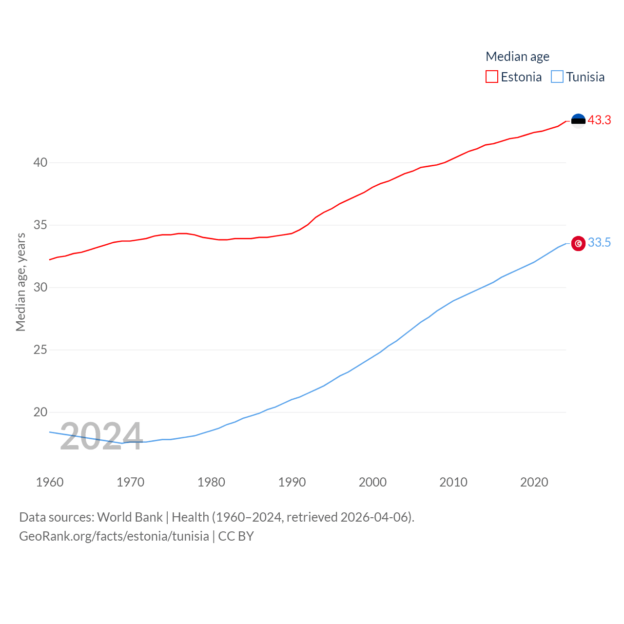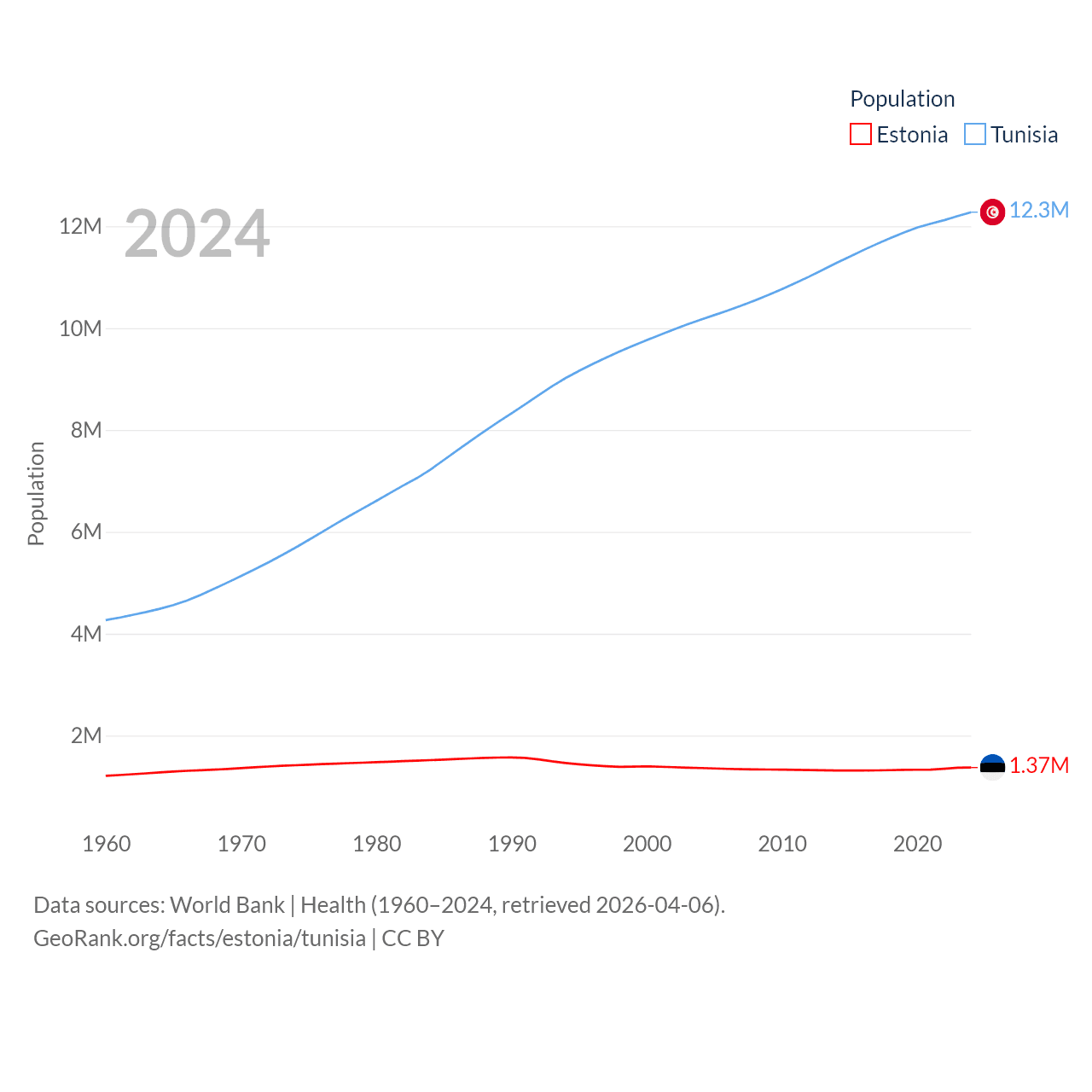Estonia has a population of 1.37M (ranked 153/197), compared with 12.3M in Tunisia (ranked 80/197). Estonia's land area is 16,498 sq mi versus 59,985 sq mi for Tunisia (ranked 129th vs. 91st).