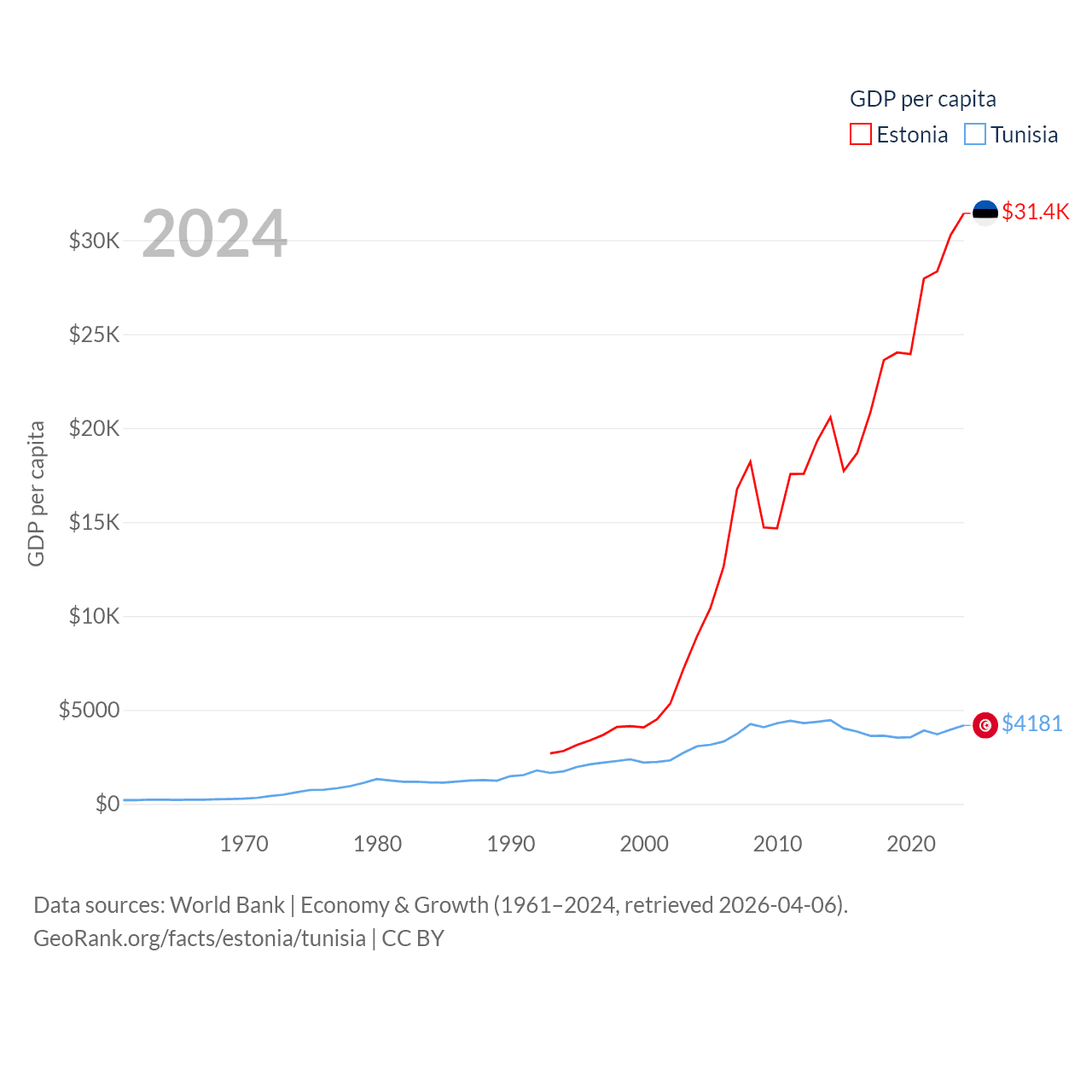 By GDP, Estonia ranks 100/197 ($43.1B) and Tunisia ranks 93/197 ($51.3B). By GDP per capita, Estonia ranks 40/197 ($31,428), while Tunisia ranks 129/197 ($4,181).