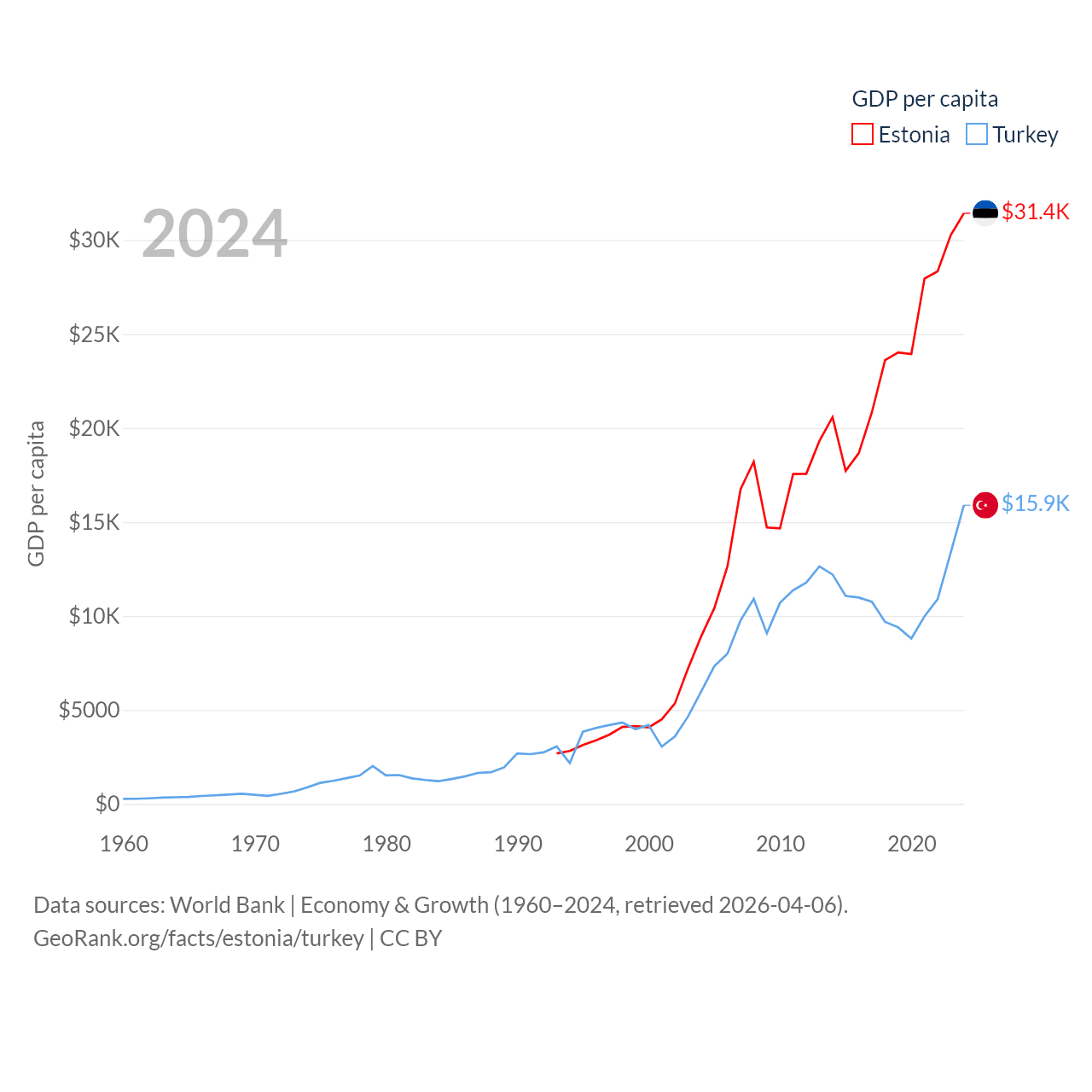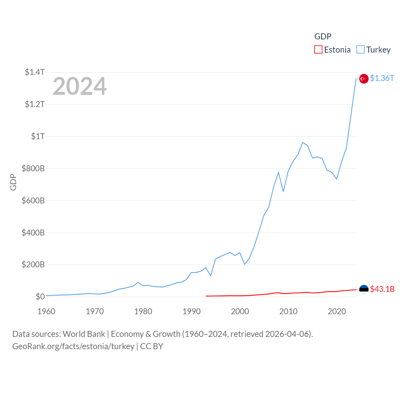 By GDP, Estonia ranks 100/197 ($43.1B) and Turkey ranks 17/197 ($1.36T). By GDP per capita, Estonia ranks 40/197 ($31,428), while Turkey ranks 66/197 ($15,893).
