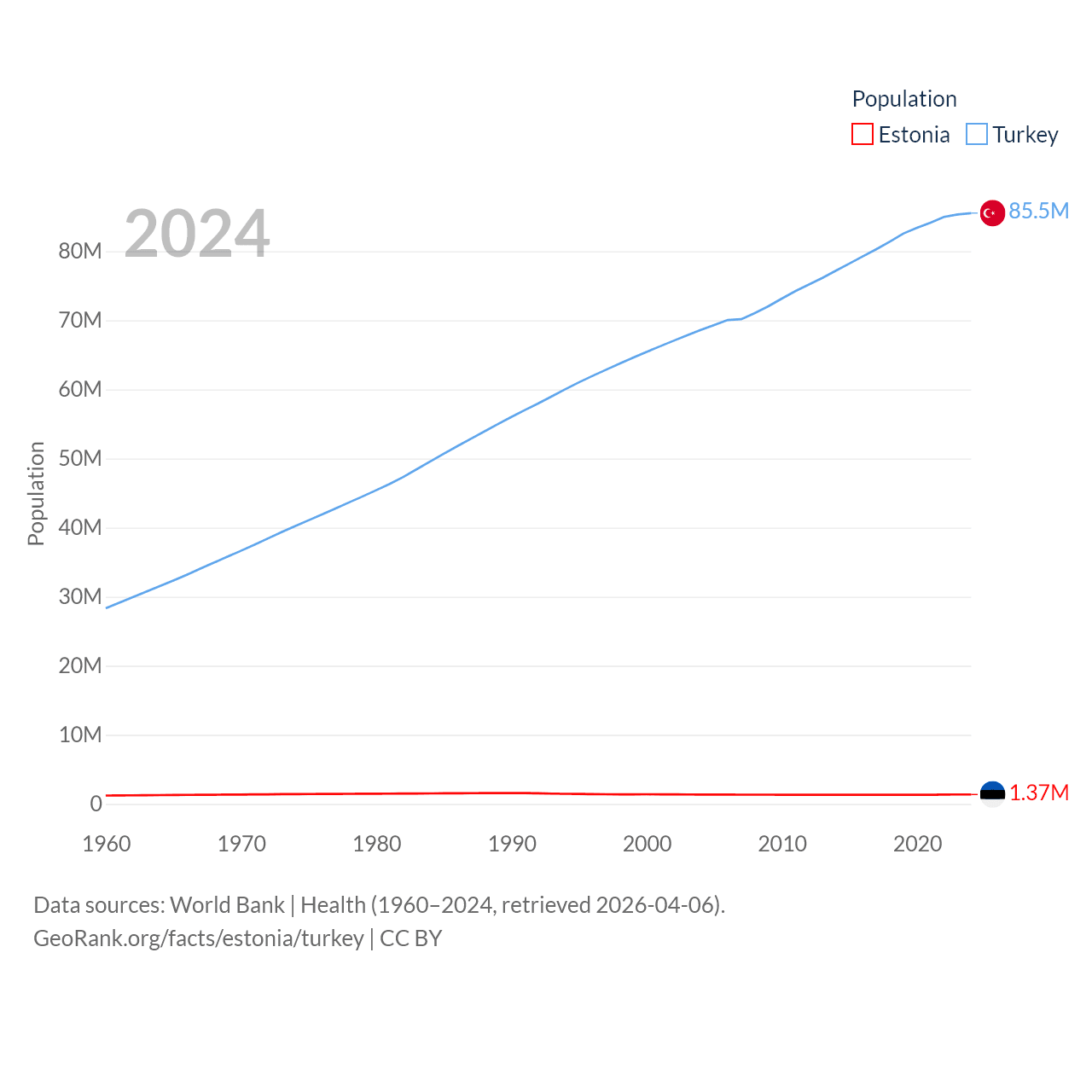 Estonia has a population of 1.37M (ranked 153/197), compared with 85.5M in Turkey (ranked 18/197). Estonia's land area is 16,498 sq mi versus 297,156 sq mi for Turkey (ranked 129th vs. 36th).