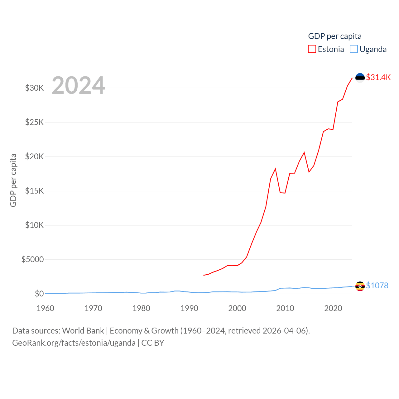 By GDP, Estonia ranks 100/197 ($43.1B) and Uganda ranks 89/197 ($53.9B). By GDP per capita, Estonia ranks 40/197 ($31,428), while Uganda ranks 176/197 ($1,078).