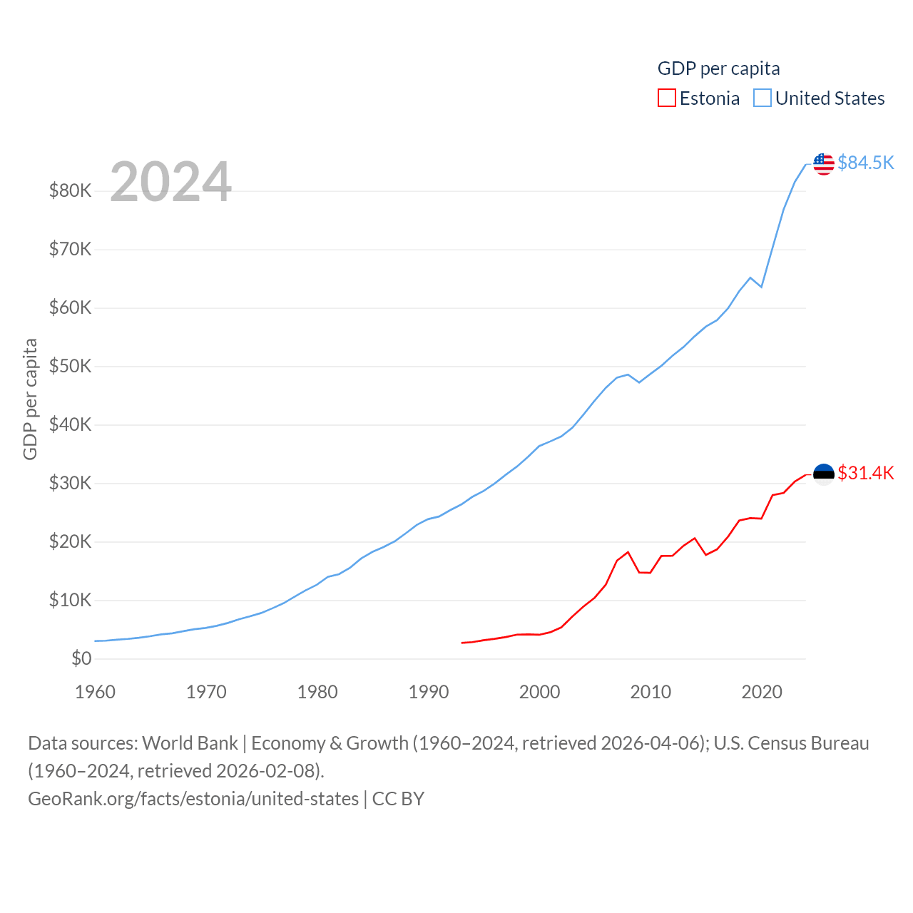 By GDP, Estonia ranks 100/197 ($43.1B) and The United States ranks 1/197 ($28.8T). By GDP per capita, Estonia ranks 40/197 ($31,428), while The United States ranks 10/197 ($84,534).