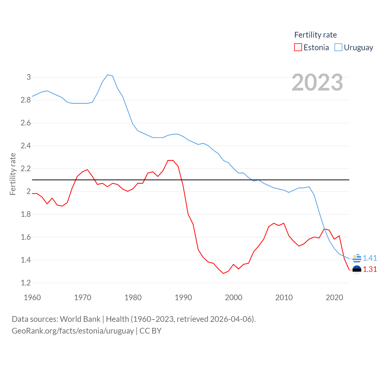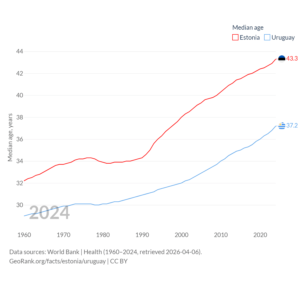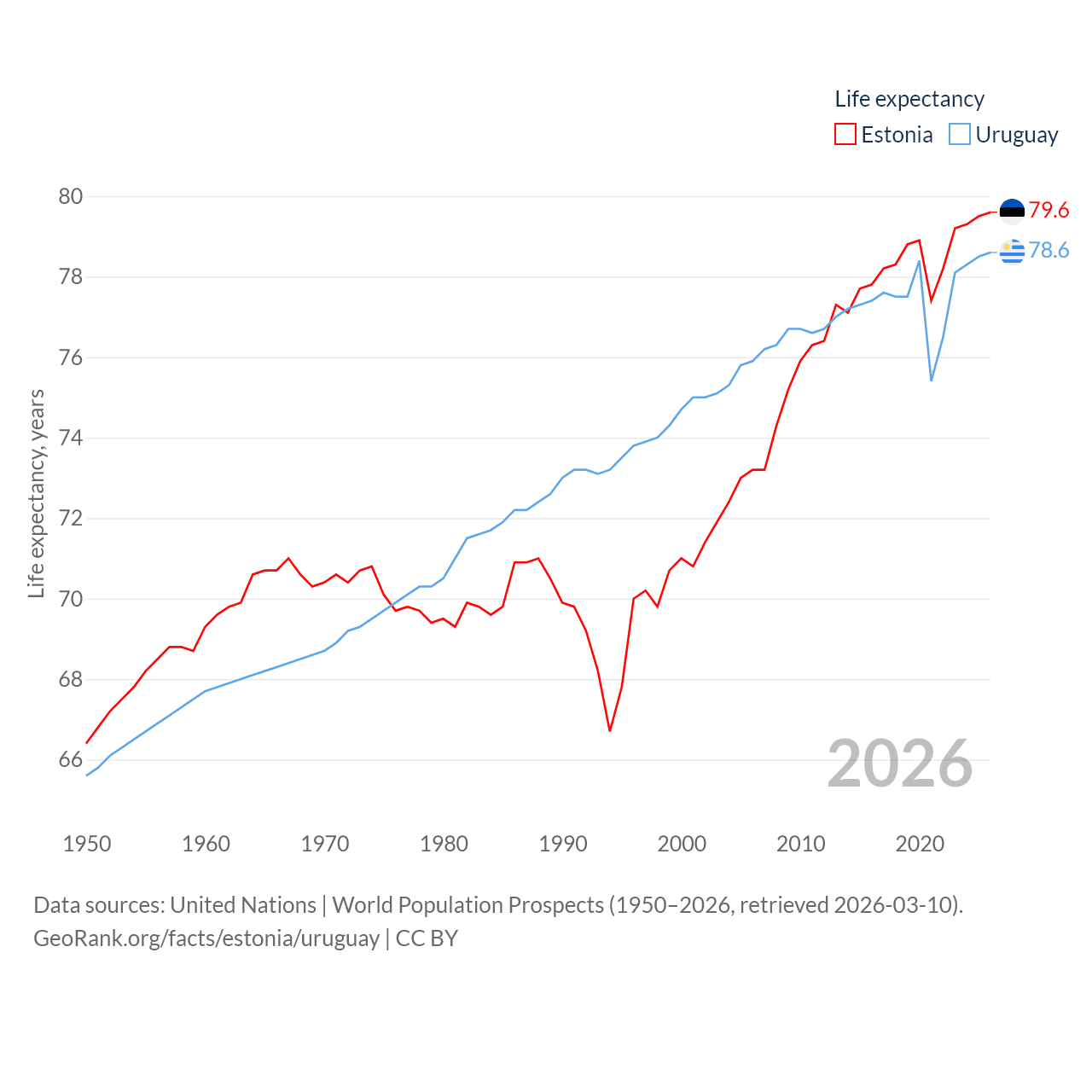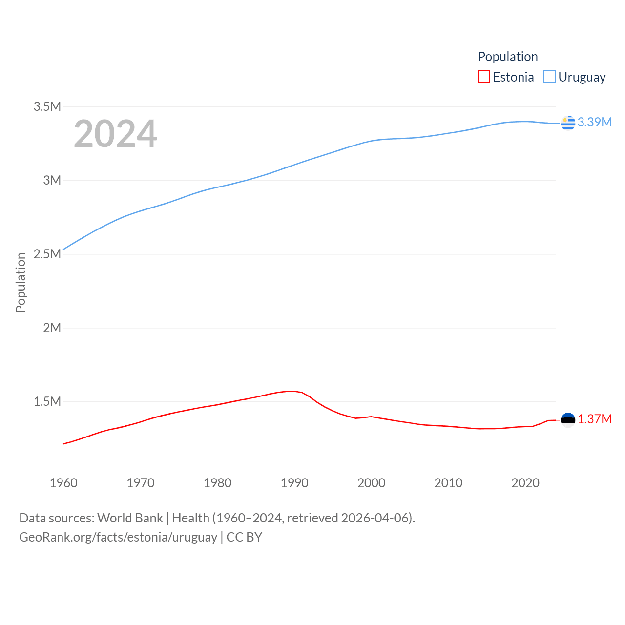 Estonia has a population of 1.37M (ranked 153/197), compared with 3.39M in Uruguay (ranked 133/197). Estonia's land area is 16,498 sq mi versus 67,576 sq mi for Uruguay (ranked 129th vs. 89th).