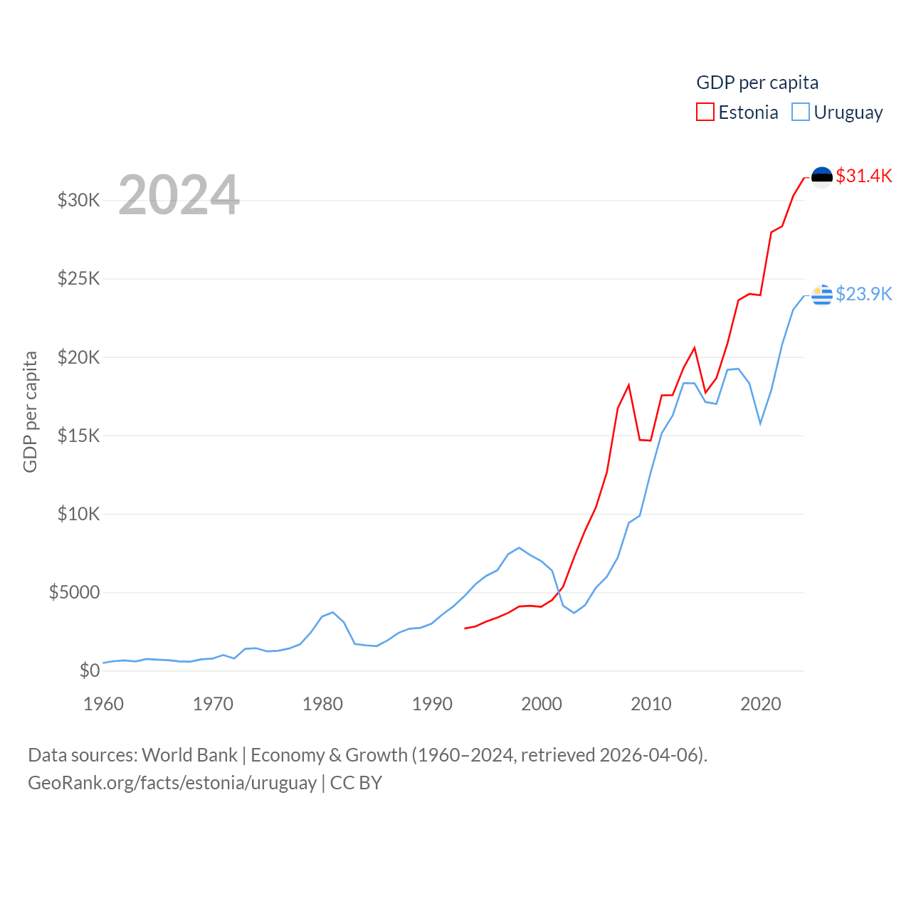By GDP, Estonia ranks 100/197 ($43.1B) and Uruguay ranks 81/197 ($81B). By GDP per capita, Estonia ranks 40/197 ($31,428), while Uruguay ranks 52/197 ($23,907).