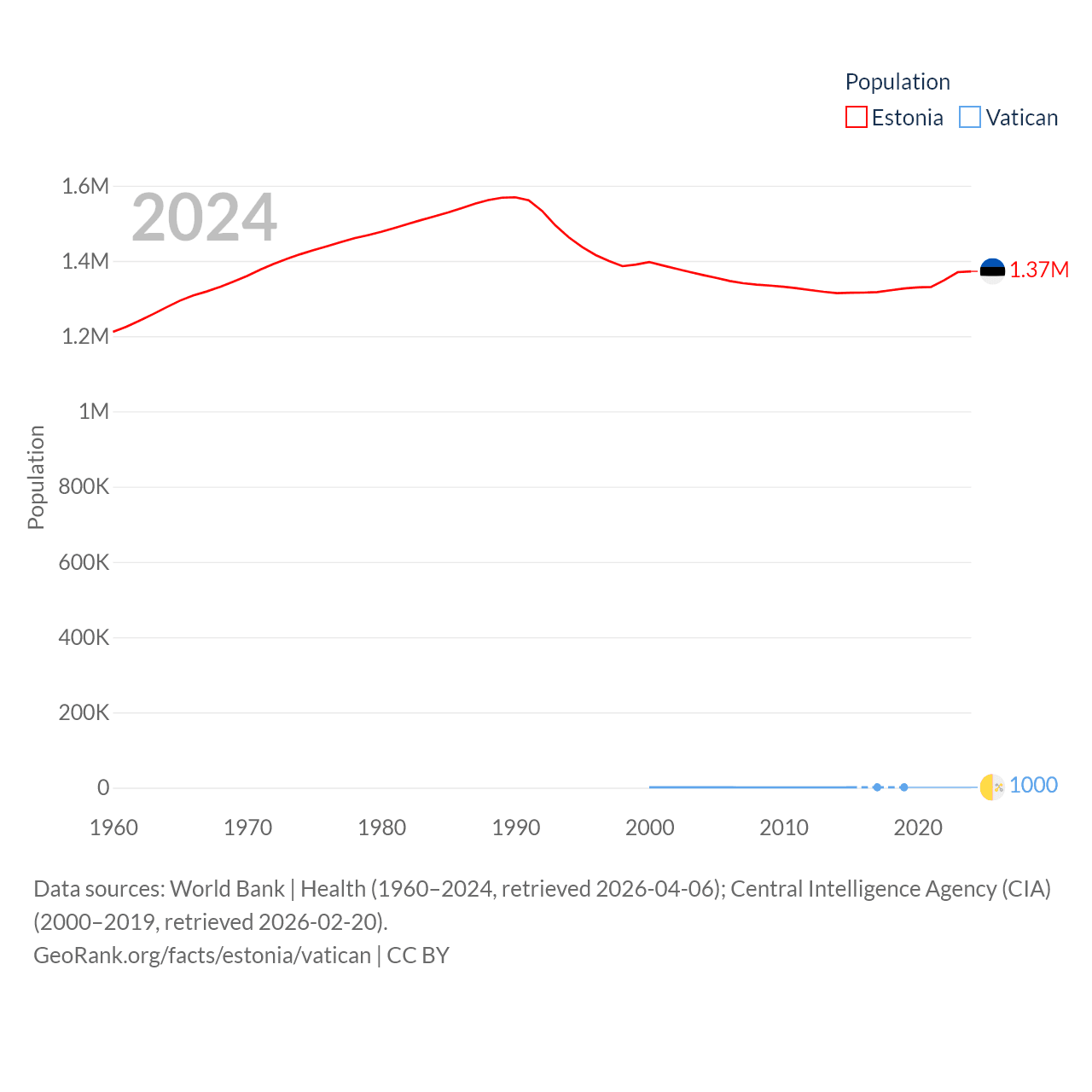 Estonia has a population of 1.37M (ranked 153/197), compared with 1K in The Vatican (ranked 197/197). Estonia's land area is 16,498 sq mi versus 0.17 sq mi for The Vatican (ranked 129th vs. 197th).