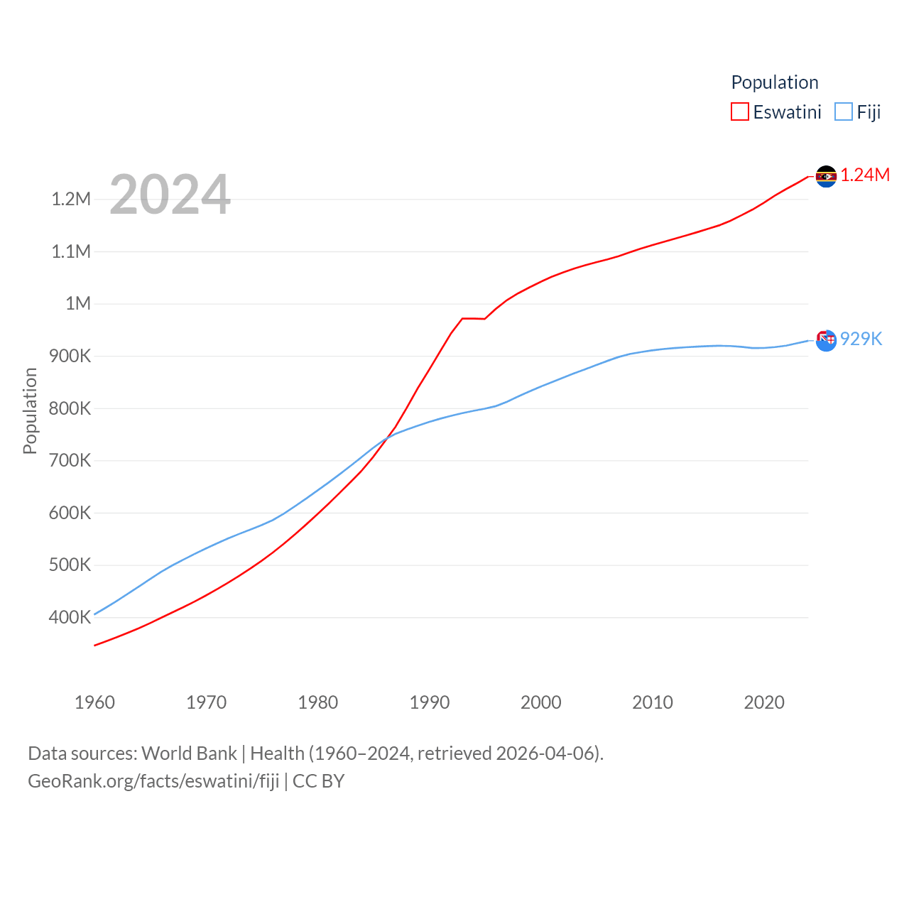 Eswatini has a population of 1.24M (ranked 157/197), compared with 929K in Fiji (ranked 159/197). Eswatini's land area is 6,641 sq mi versus 7,054 sq mi for Fiji (ranked 154th vs. 152nd).
