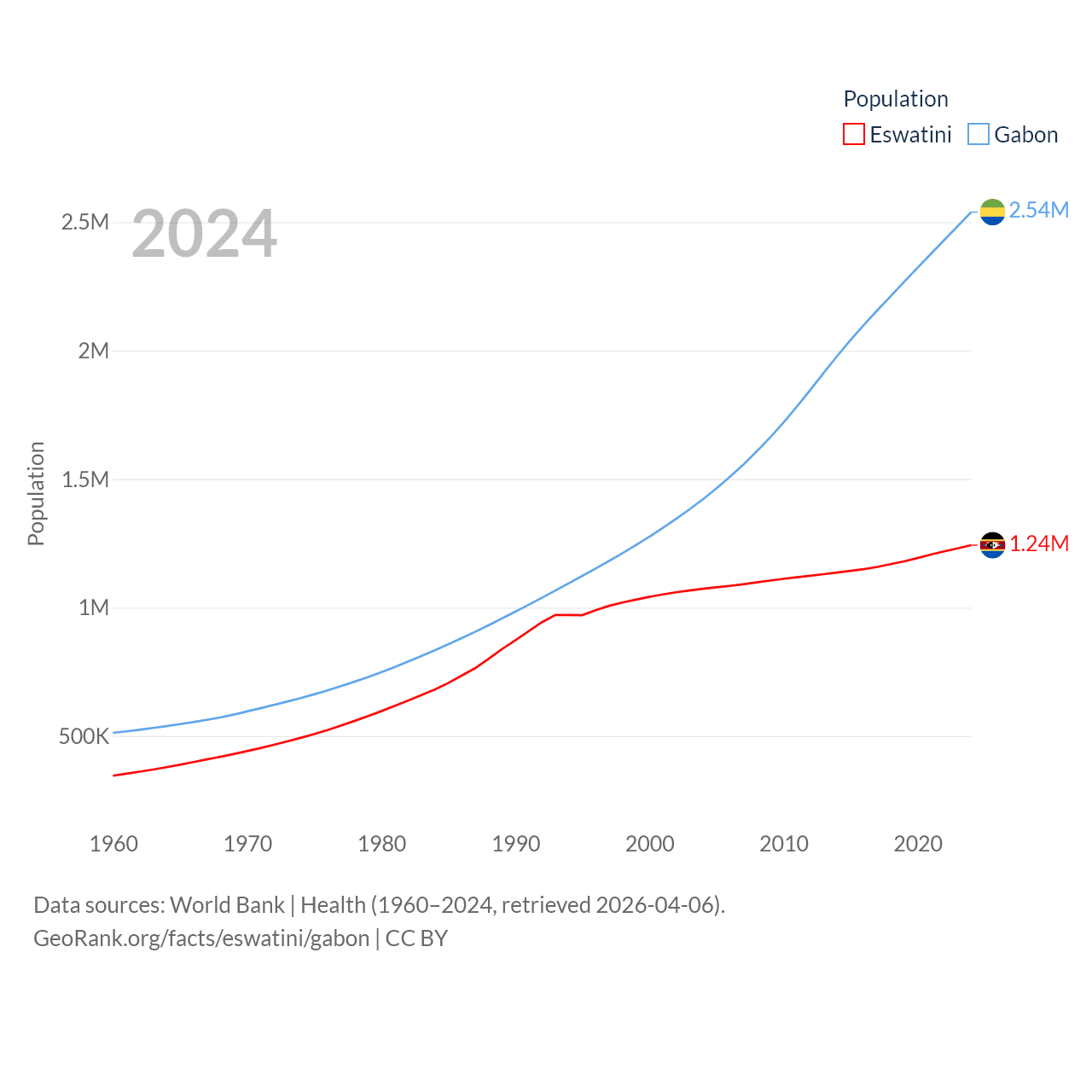 Eswatini has a population of 1.24M (ranked 157/197), compared with 2.54M in Gabon (ranked 141/197). Eswatini's land area is 6,641 sq mi versus 99,487 sq mi for Gabon (ranked 154th vs. 75th).
