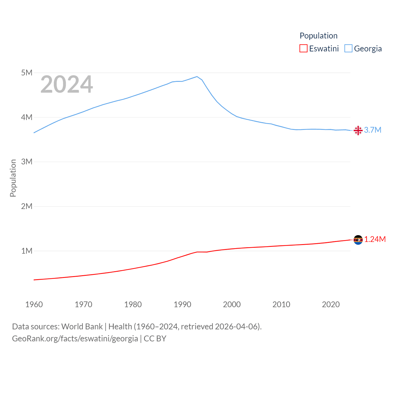 Eswatini has a population of 1.24M (ranked 157/197), compared with 3.7M in Georgia (ranked 130/197). Eswatini's land area is 6,641 sq mi versus 26,830 sq mi for Georgia (ranked 154th vs. 118th).