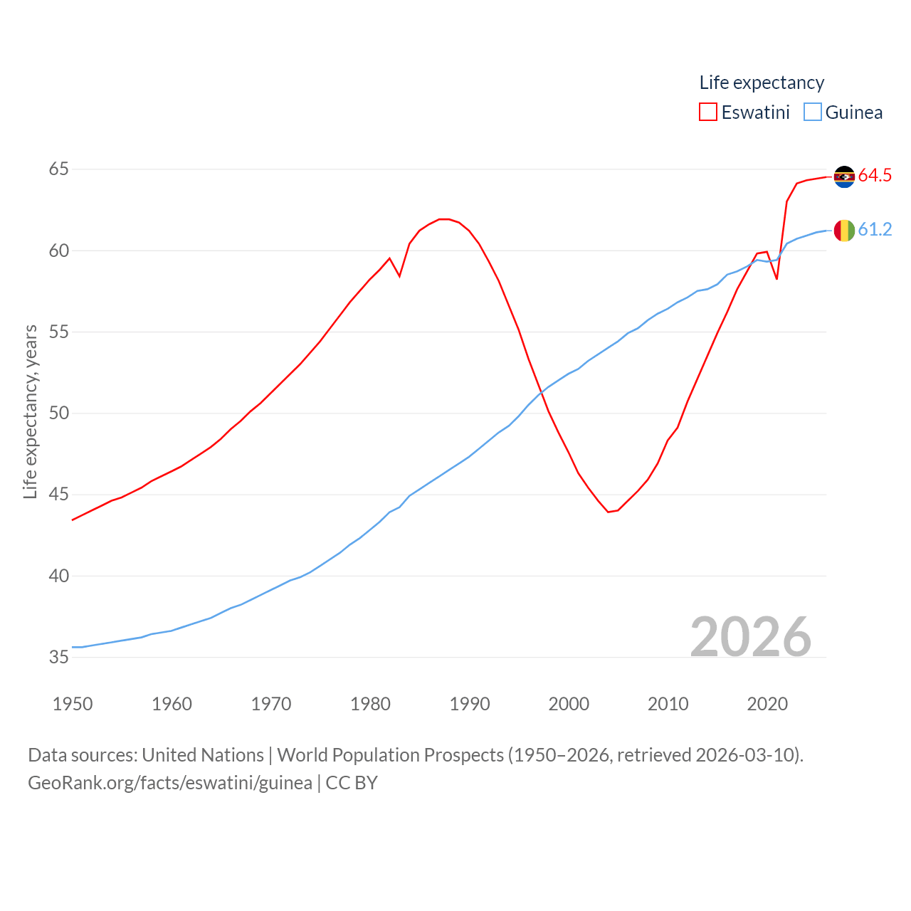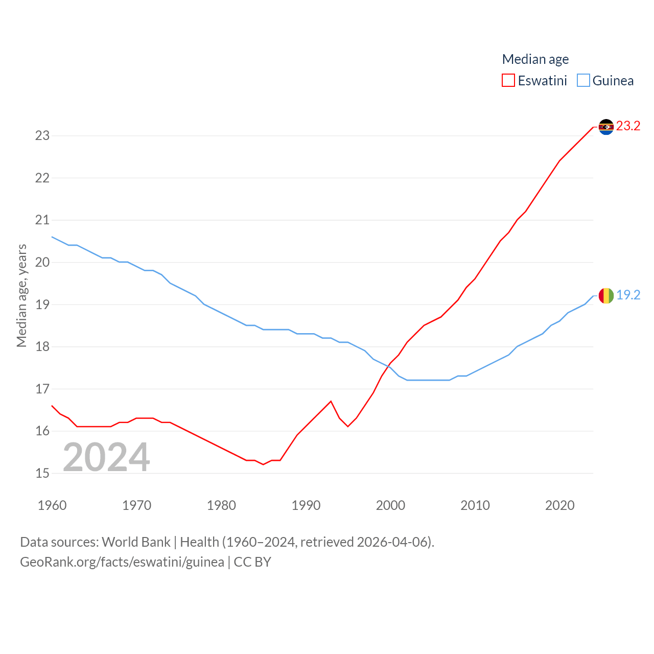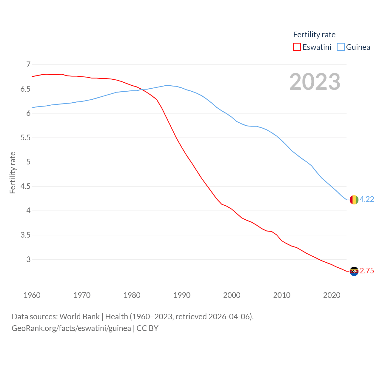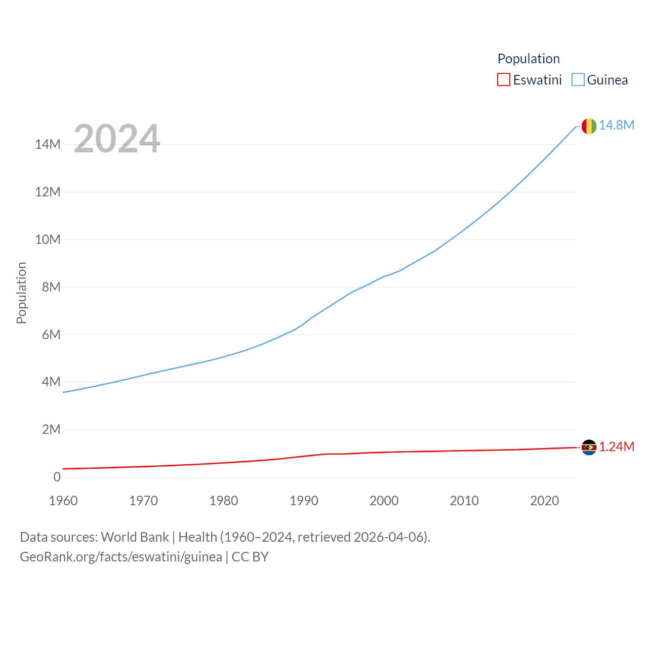 Eswatini has a population of 1.24M (ranked 157/197), compared with 14.8M in Guinea (ranked 75/197). Eswatini's land area is 6,641 sq mi versus 94,873 sq mi for Guinea (ranked 154th vs. 77th).