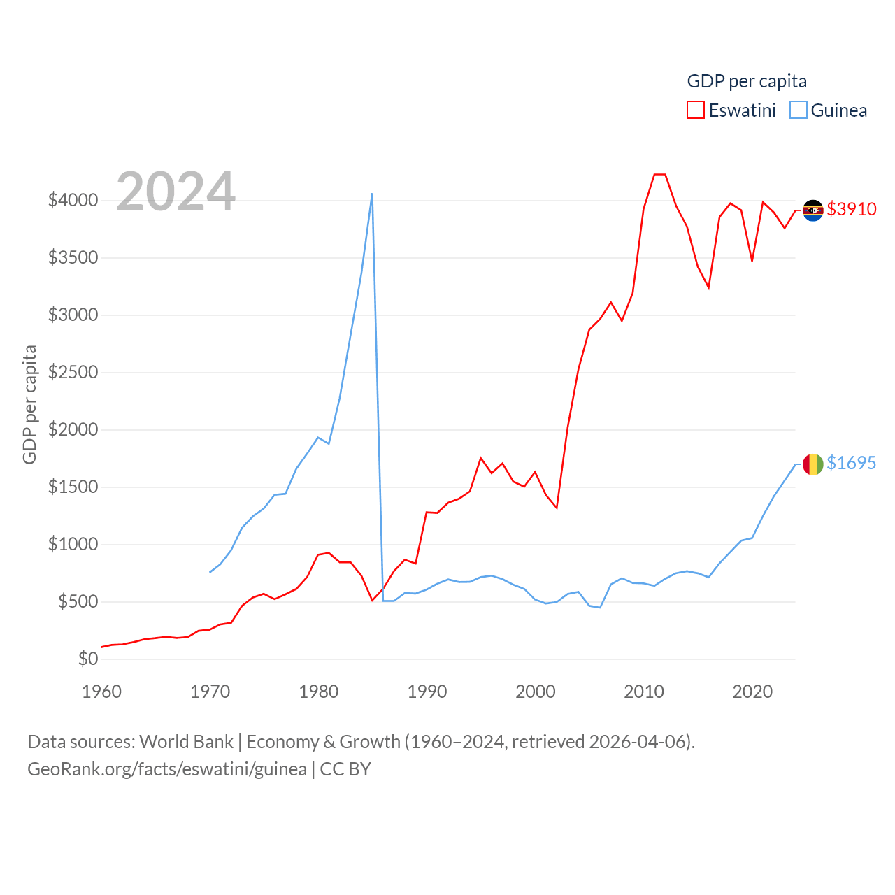 By GDP, Eswatini ranks 162/197 ($4.86B) and Guinea ranks 118/197 ($25B). By GDP per capita, Eswatini ranks 131/197 ($3,910), while Guinea ranks 160/197 ($1,695).
