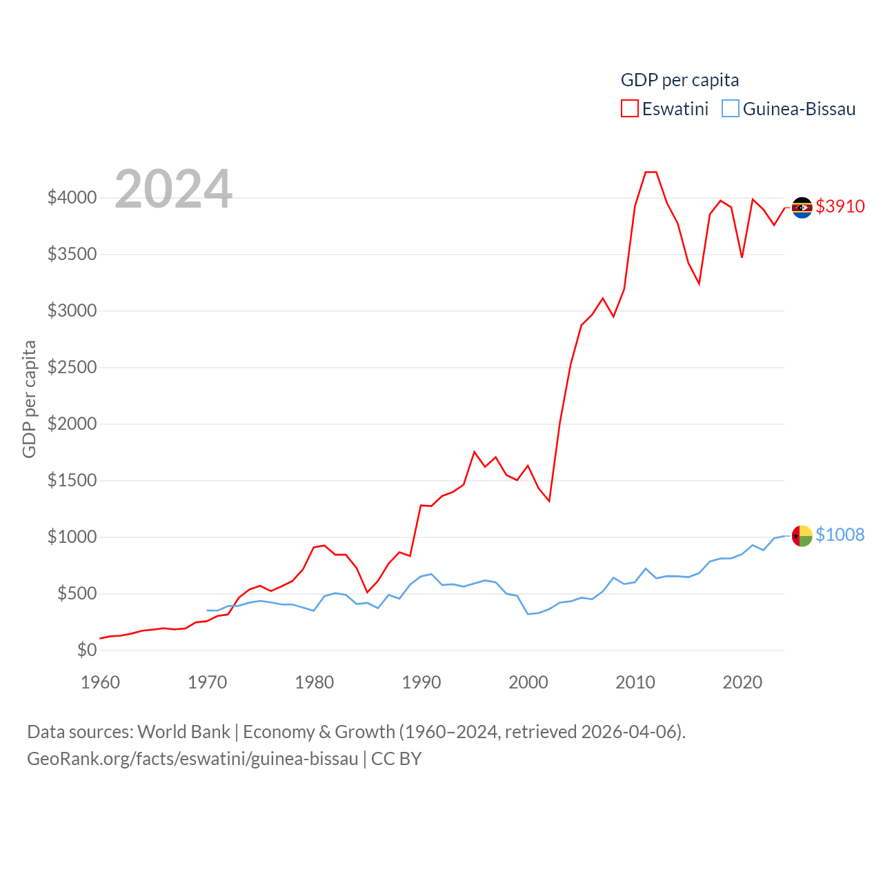 By GDP, Eswatini ranks 162/197 ($4.86B) and Guinea-Bissau ranks 176/197 ($2.22B). By GDP per capita, Eswatini ranks 131/197 ($3,910), while Guinea-Bissau ranks 177/197 ($1,008).