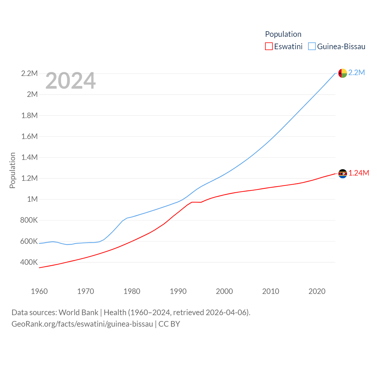 Eswatini has a population of 1.24M (ranked 157/197), compared with 2.2M in Guinea-Bissau (ranked 146/197). Eswatini's land area is 6,641 sq mi versus 10,857 sq mi for Guinea-Bissau (ranked 154th vs. 139th).