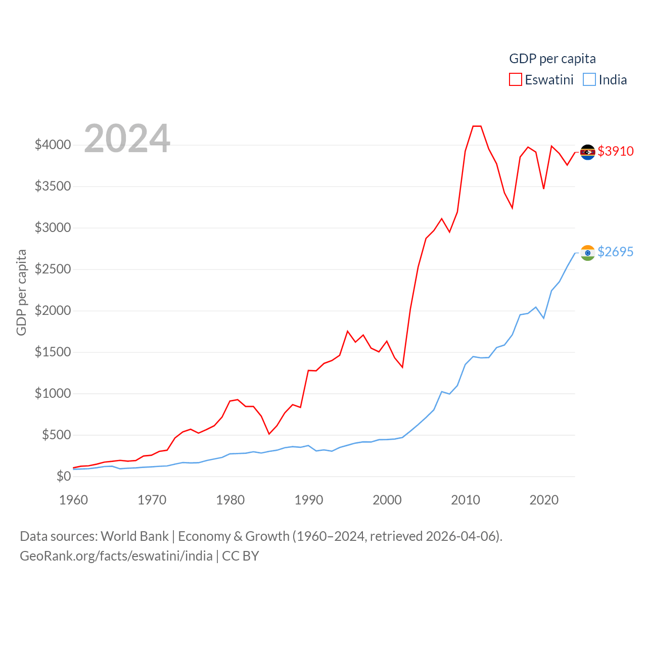 By GDP, Eswatini ranks 162/197 ($4.86B) and India ranks 5/197 ($3.91T). By GDP per capita, Eswatini ranks 131/197 ($3,910), while India ranks 143/197 ($2,695).