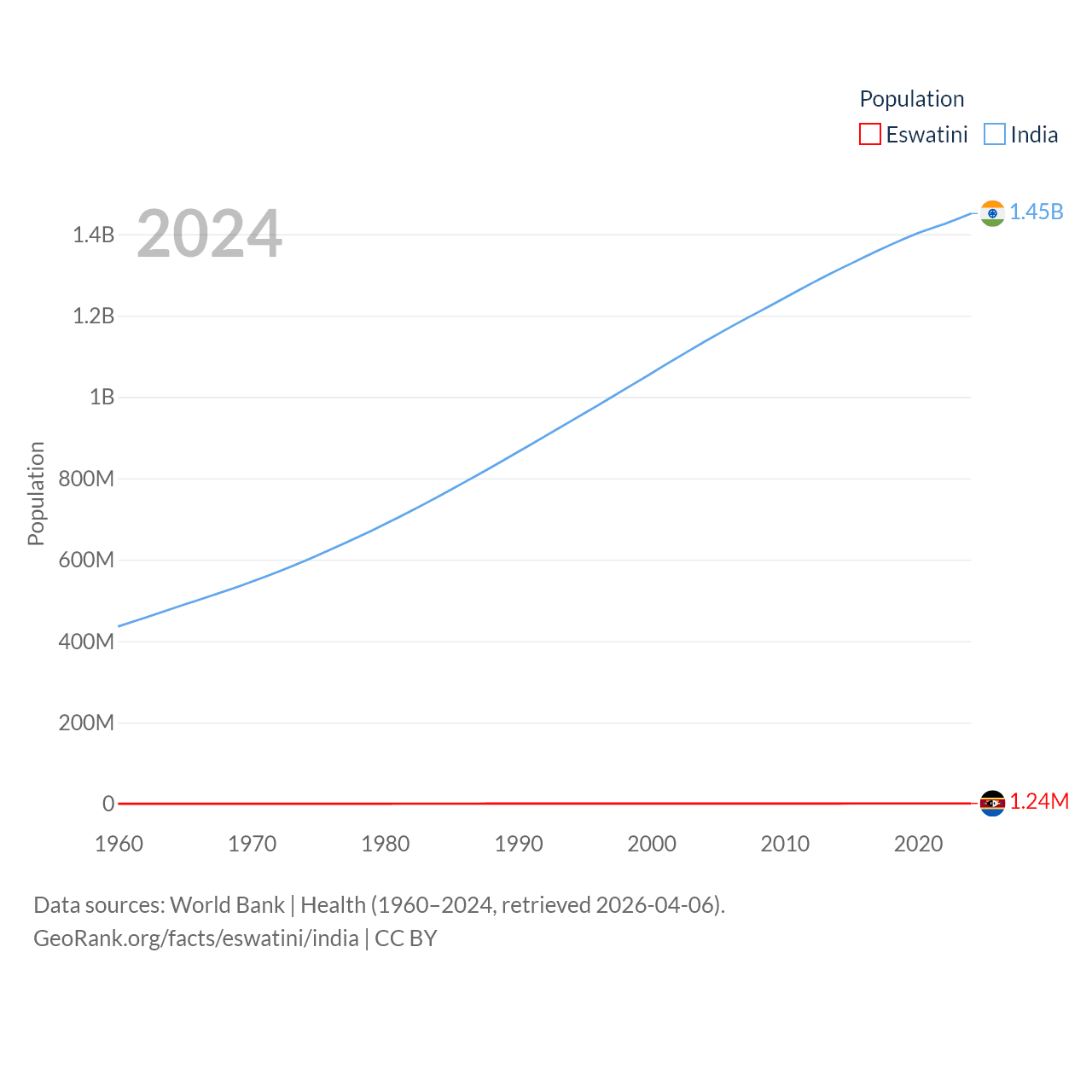 Eswatini has a population of 1.24M (ranked 157/197), compared with 1.45B in India (ranked 1/197). Eswatini's land area is 6,641 sq mi versus 1,147,955 sq mi for India (ranked 154th vs. 7th).