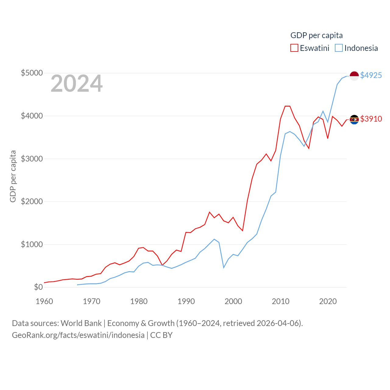 By GDP, Eswatini ranks 162/197 ($4.86B) and Indonesia ranks 16/197 ($1.4T). By GDP per capita, Eswatini ranks 131/197 ($3,910), while Indonesia ranks 121/197 ($4,925).
