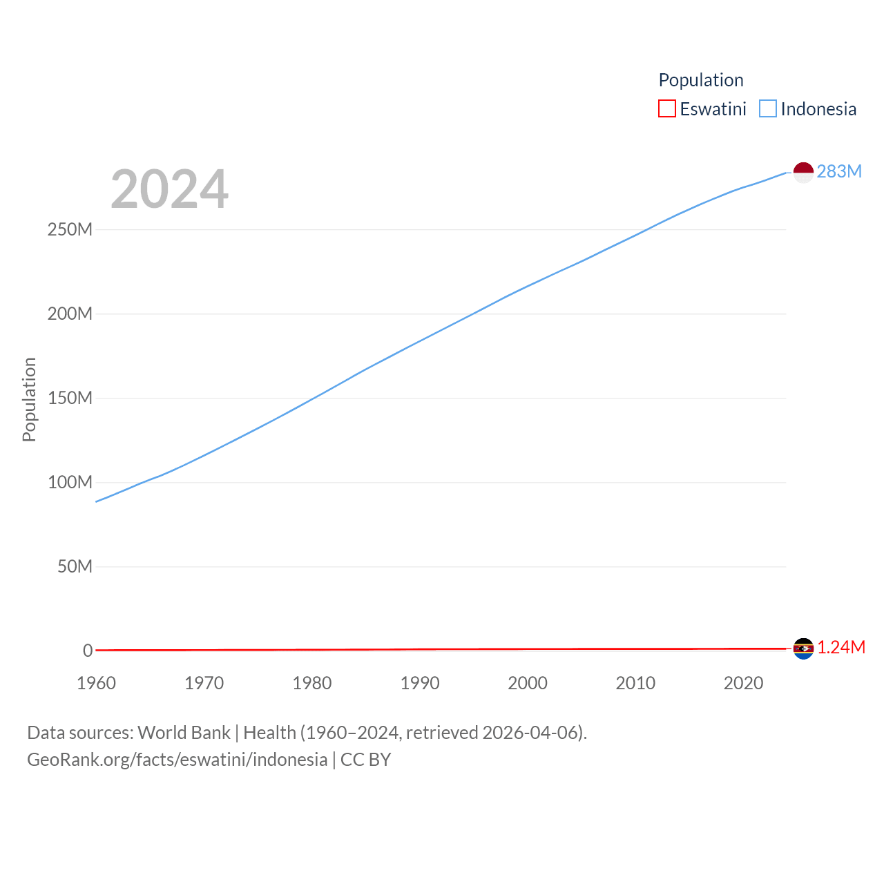 Eswatini has a population of 1.24M (ranked 157/197), compared with 283M in Indonesia (ranked 4/197). Eswatini's land area is 6,641 sq mi versus 730,720 sq mi for Indonesia (ranked 154th vs. 14th).