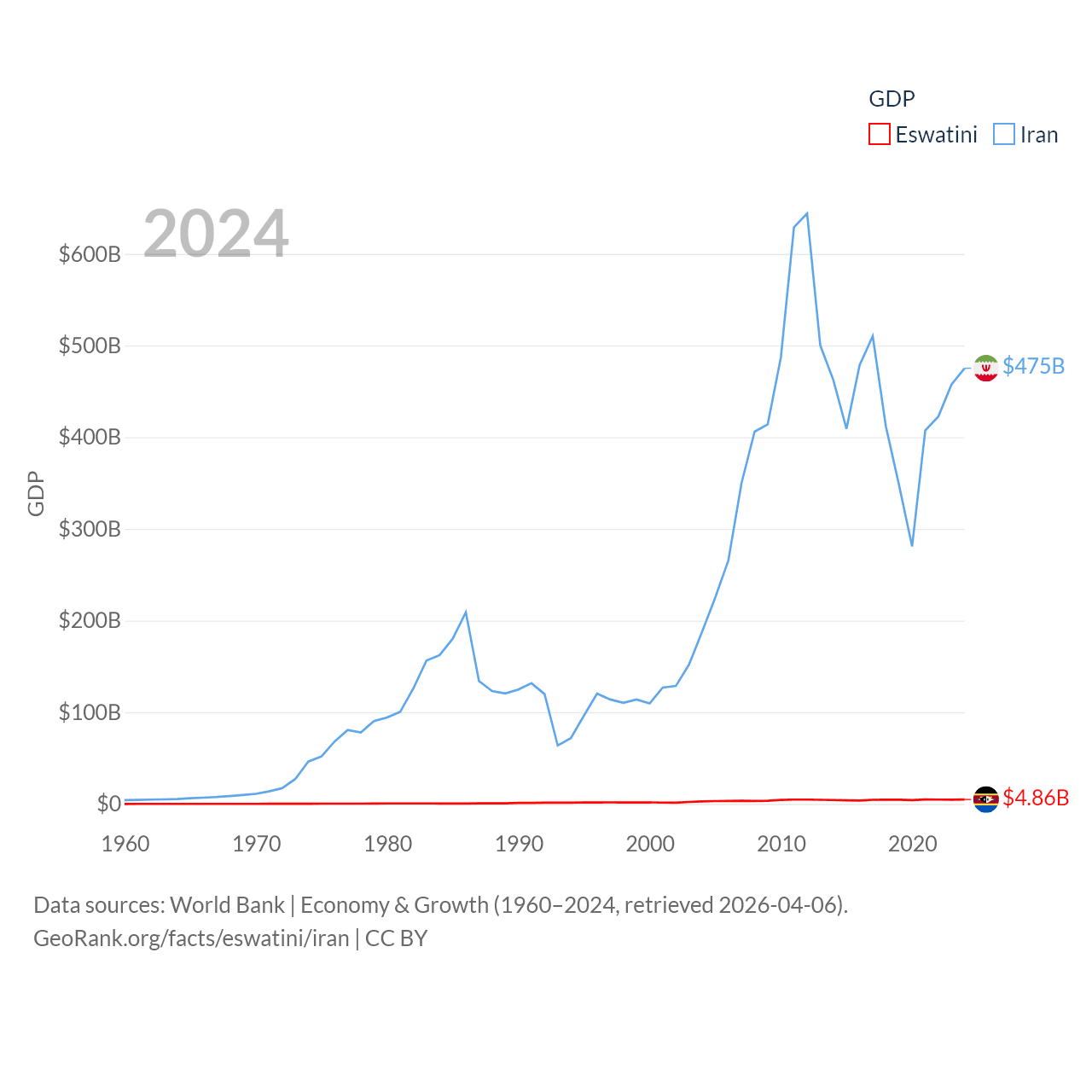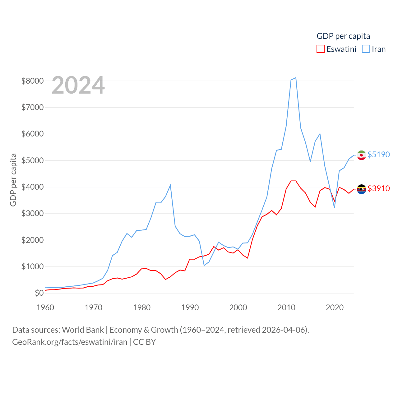 By GDP, Eswatini ranks 162/197 ($4.86B) and Iran ranks 34/197 ($475B). By GDP per capita, Eswatini ranks 131/197 ($3,910), while Iran ranks 119/197 ($5,190).