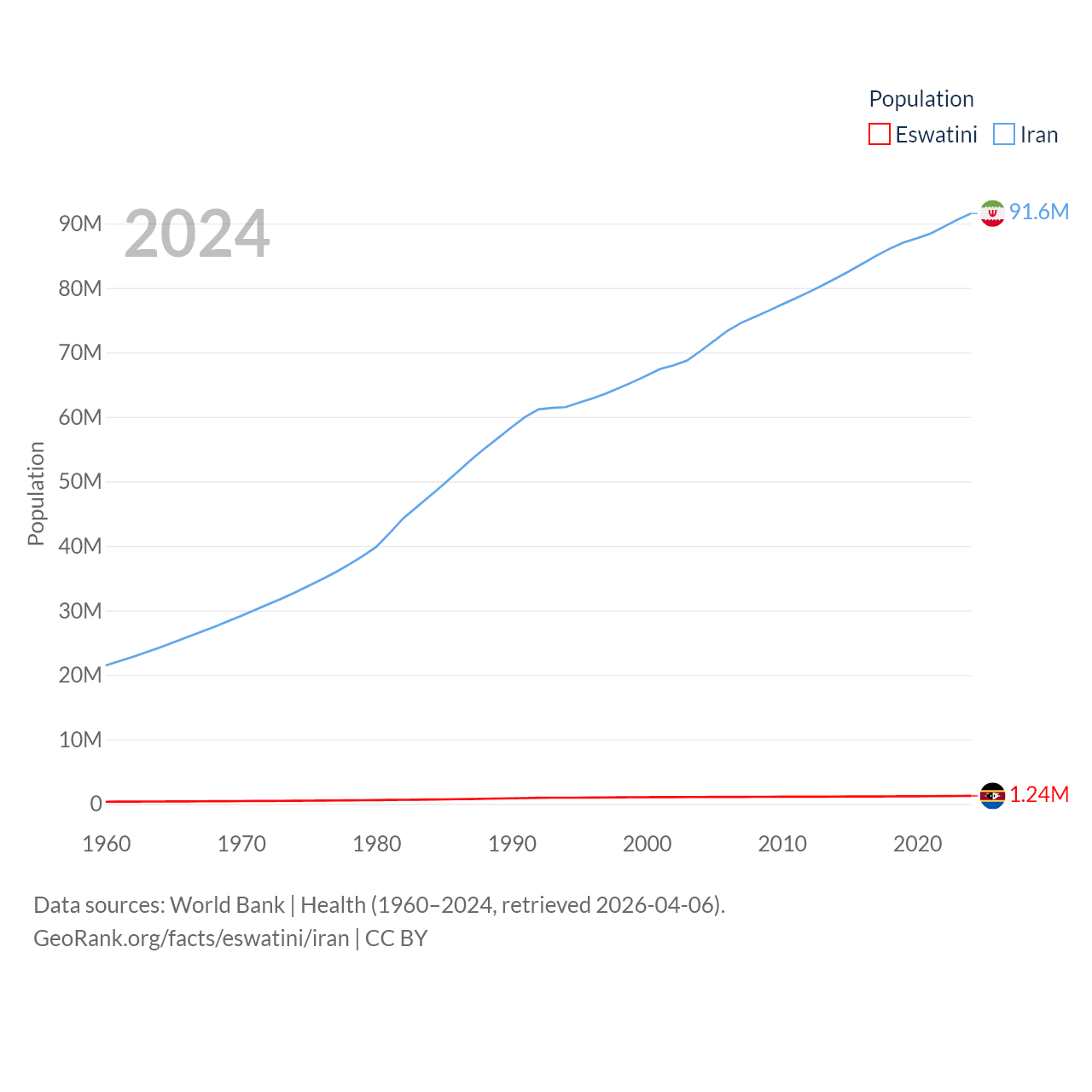 Eswatini has a population of 1.24M (ranked 157/197), compared with 91.6M in Iran (ranked 17/197). Eswatini's land area is 6,641 sq mi versus 626,451 sq mi for Iran (ranked 154th vs. 17th).