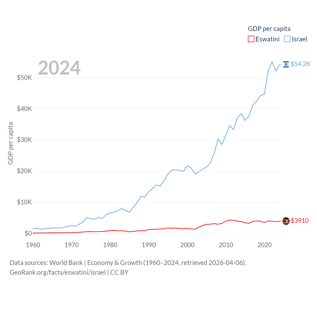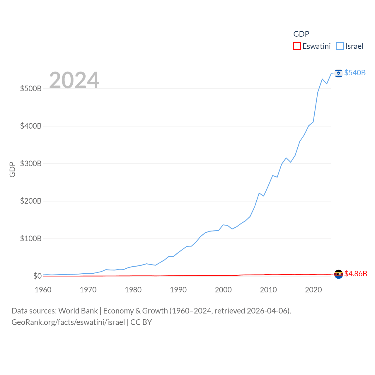 By GDP, Eswatini ranks 162/197 ($4.86B) and Israel ranks 29/197 ($540B). By GDP per capita, Eswatini ranks 131/197 ($3,910), while Israel ranks 21/197 ($54,177).