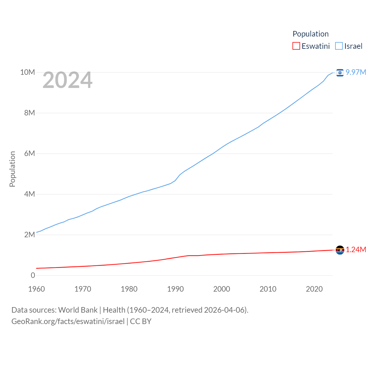 Eswatini has a population of 1.24M (ranked 157/197), compared with 9.97M in Israel (ranked 96/197). Eswatini's land area is 6,641 sq mi versus 8,355 sq mi for Israel (ranked 154th vs. 149th).