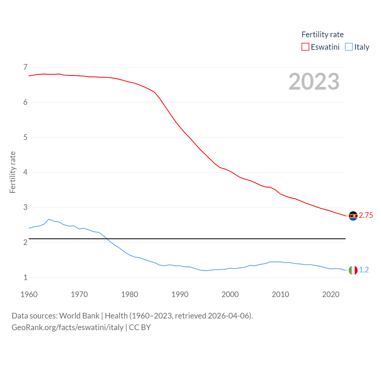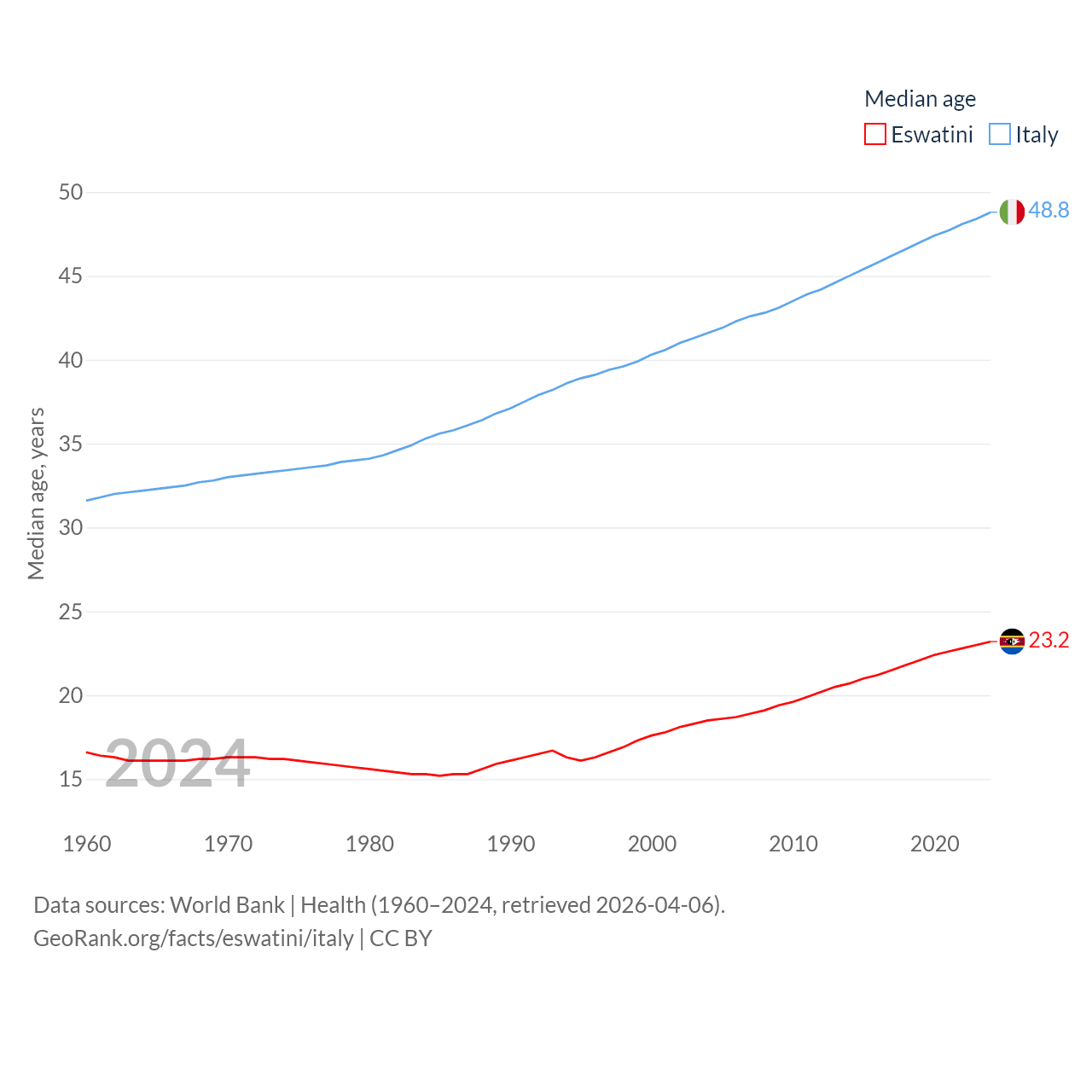Eswatini has a population of 1.24M (ranked 157/197), compared with 59M in Italy (ranked 25/197). Eswatini's land area is 6,641 sq mi versus 114,178 sq mi for Italy (ranked 154th vs. 72nd).