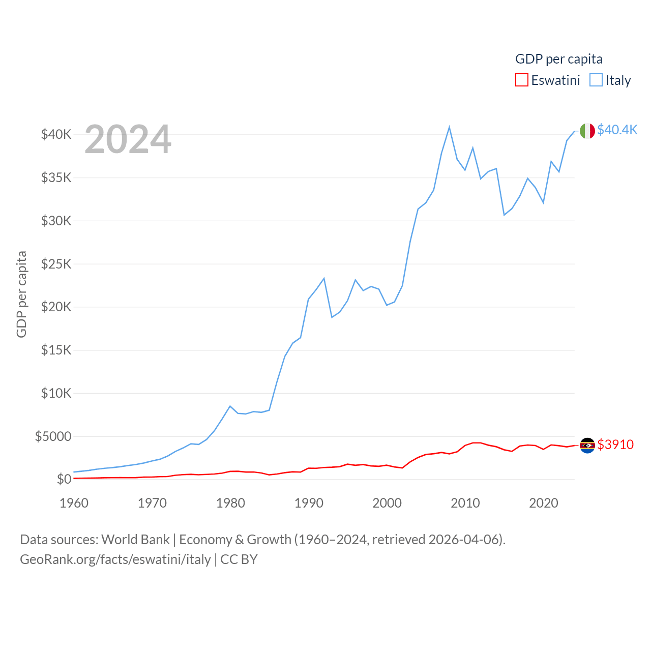 By GDP, Eswatini ranks 162/197 ($4.86B) and Italy ranks 8/197 ($2.38T). By GDP per capita, Eswatini ranks 131/197 ($3,910), while Italy ranks 29/197 ($40,385).