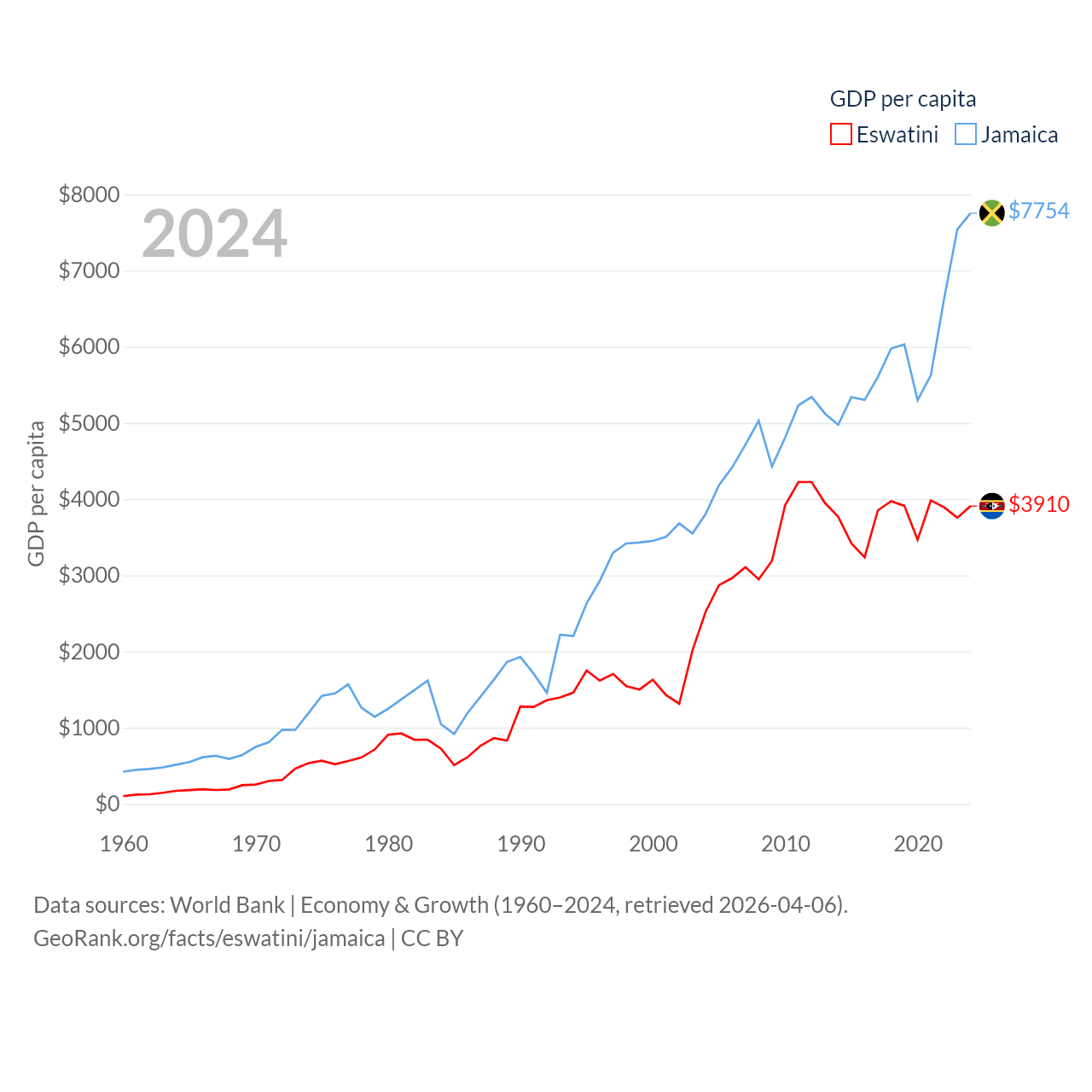 By GDP, Eswatini ranks 162/197 ($4.86B) and Jamaica ranks 124/197 ($22B). By GDP per capita, Eswatini ranks 131/197 ($3,910), while Jamaica ranks 95/197 ($7,754).