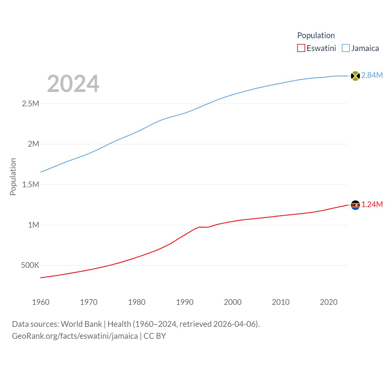 Eswatini has a population of 1.24M (ranked 157/197), compared with 2.84M in Jamaica (ranked 139/197). Eswatini's land area is 6,641 sq mi versus 4,181 sq mi for Jamaica (ranked 154th vs. 159th).