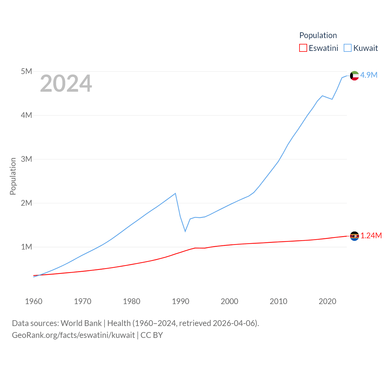 Eswatini has a population of 1.24M (ranked 157/197), compared with 4.9M in Kuwait (ranked 127/197). Eswatini's land area is 6,641 sq mi versus 6,880 sq mi for Kuwait (ranked 154th vs. 153rd).
