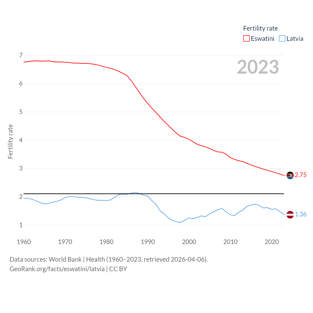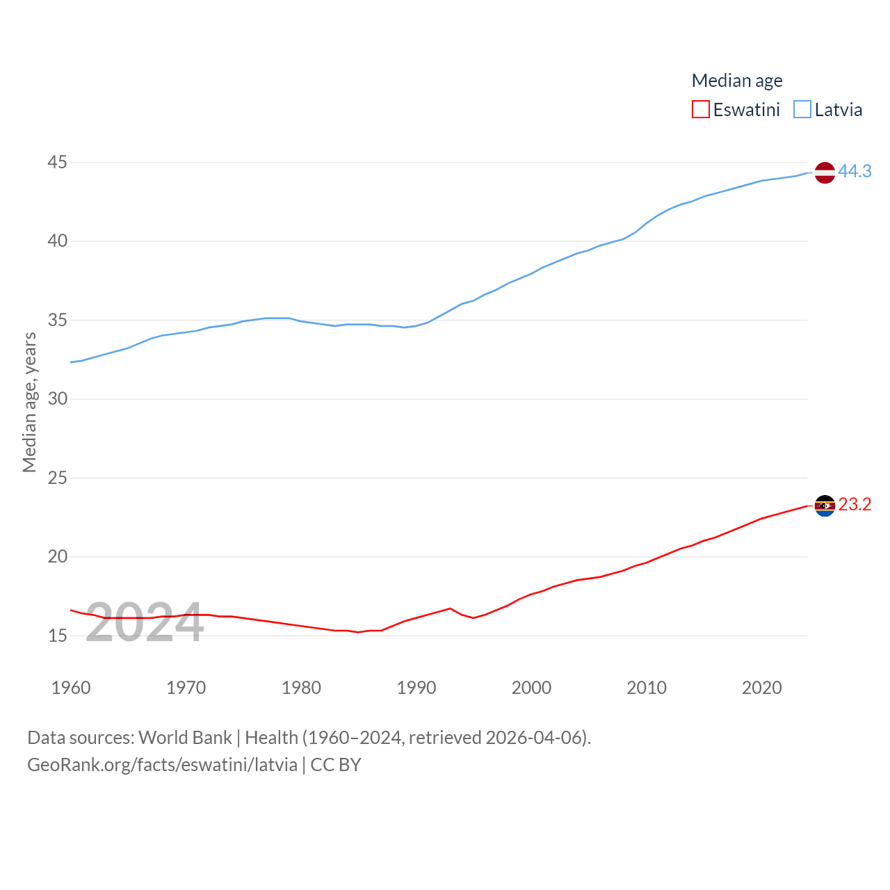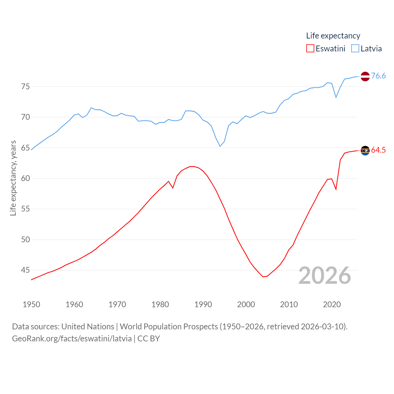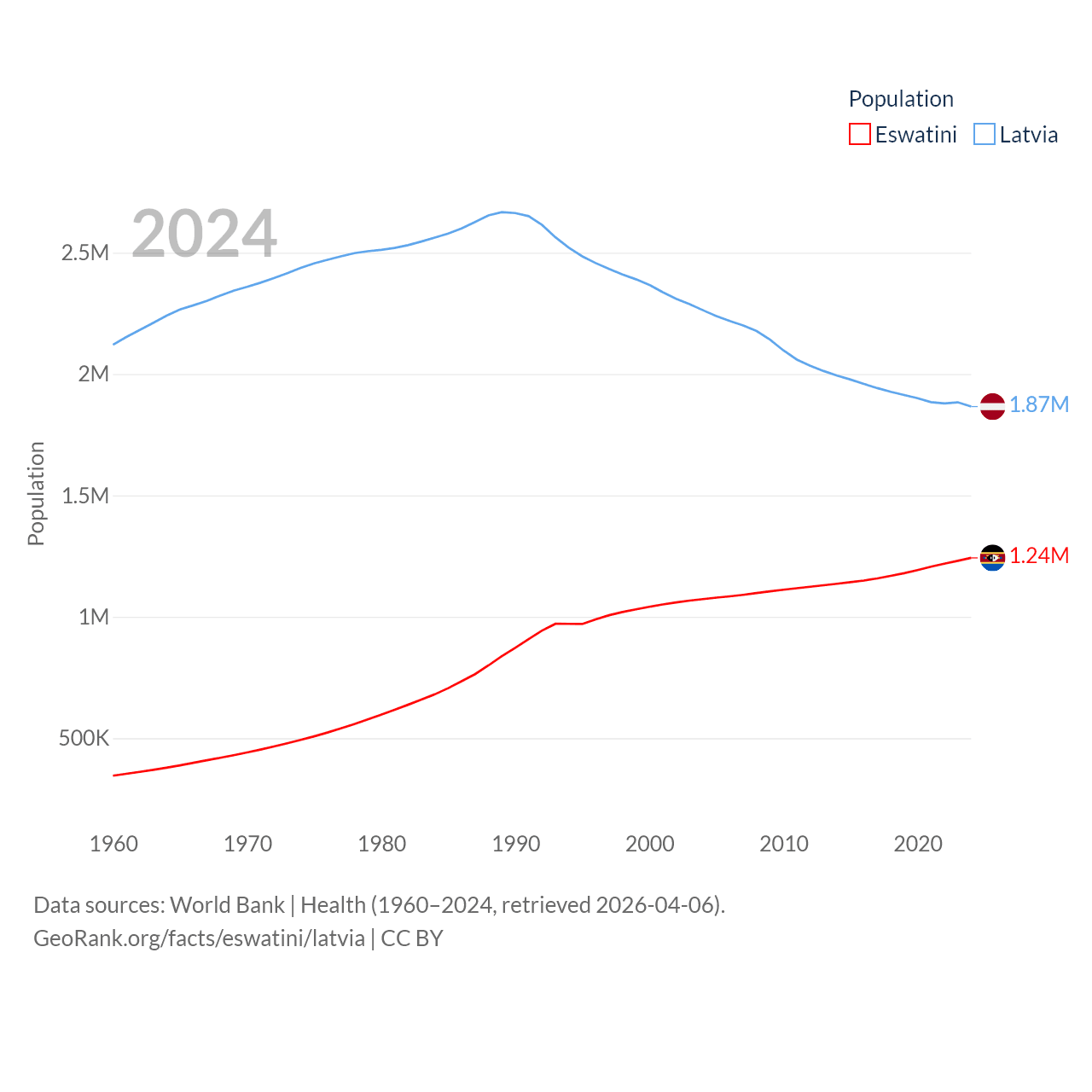 Eswatini has a population of 1.24M (ranked 157/197), compared with 1.87M in Latvia (ranked 149/197). Eswatini's land area is 6,641 sq mi versus 24,027 sq mi for Latvia (ranked 154th vs. 121st).