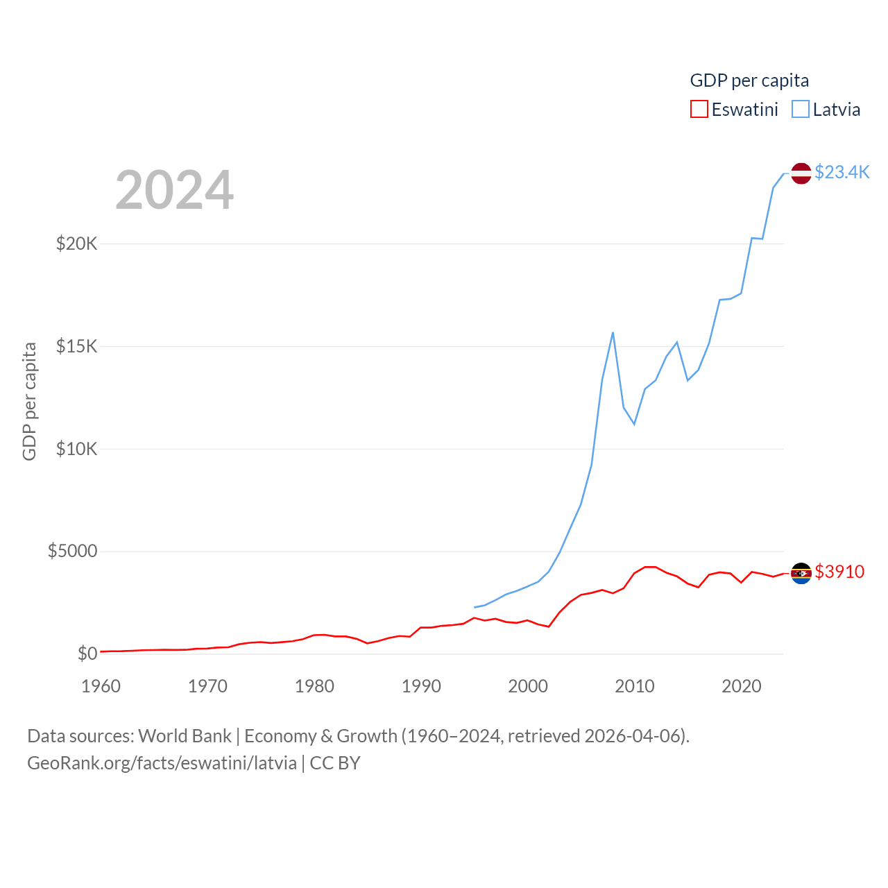 By GDP, Eswatini ranks 162/197 ($4.86B) and Latvia ranks 99/197 ($43.7B). By GDP per capita, Eswatini ranks 131/197 ($3,910), while Latvia ranks 54/197 ($23,409).