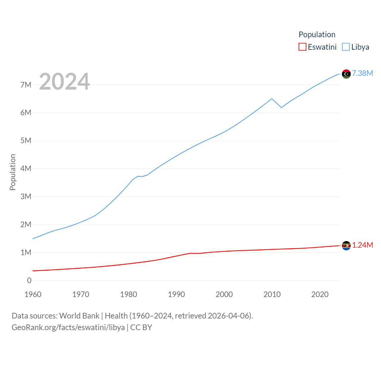 Eswatini has a population of 1.24M (ranked 157/197), compared with 7.38M in Libya (ranked 105/197). Eswatini's land area is 6,641 sq mi versus 679,362 sq mi for Libya (ranked 154th vs. 16th).